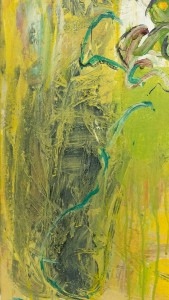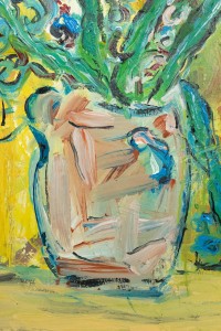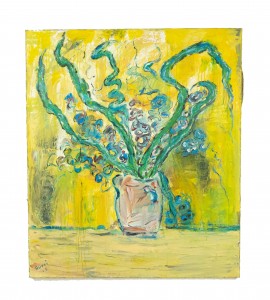 Acrylic on canvas still life of flowers in a vase with a yellow background by Richard Rumi, "Irises"..