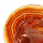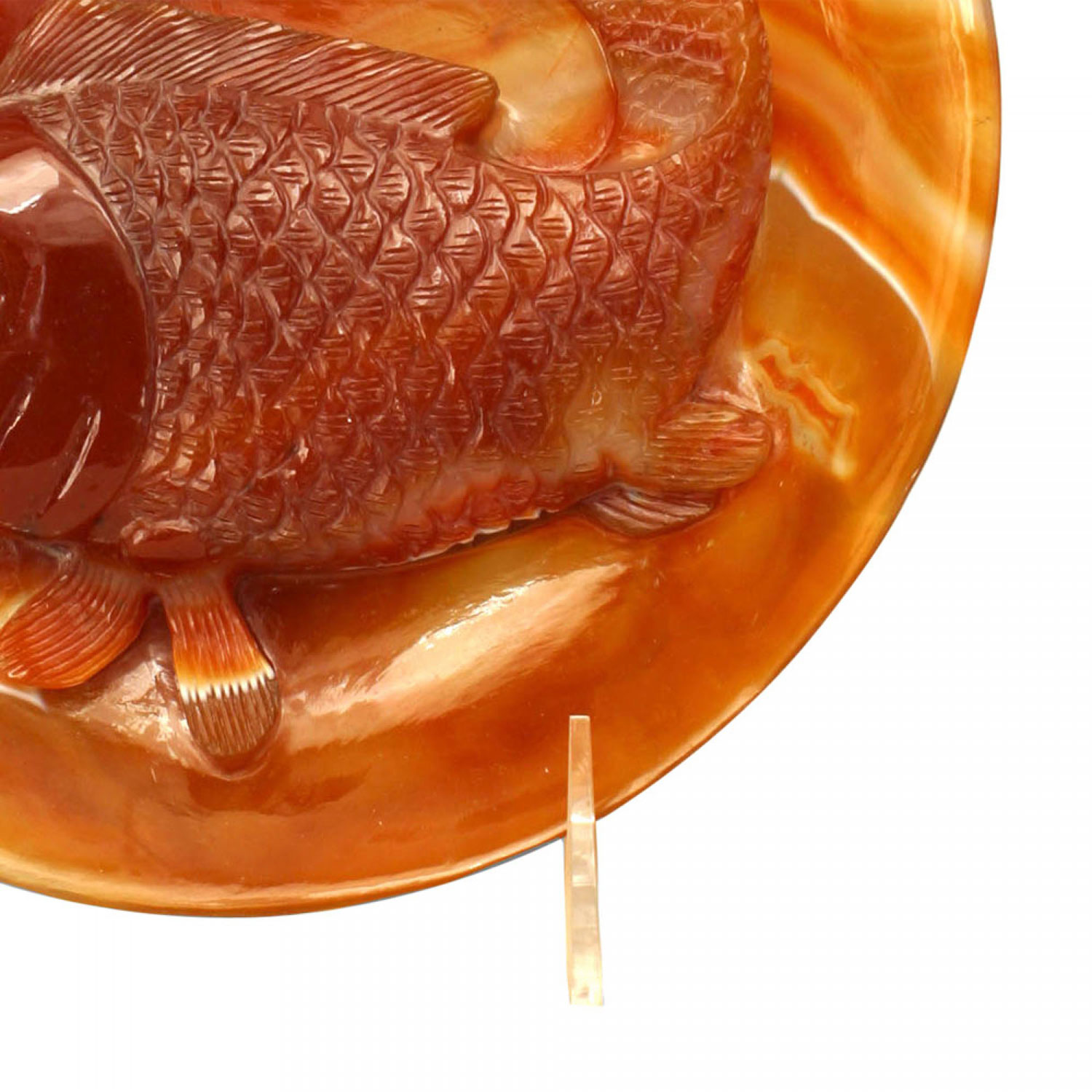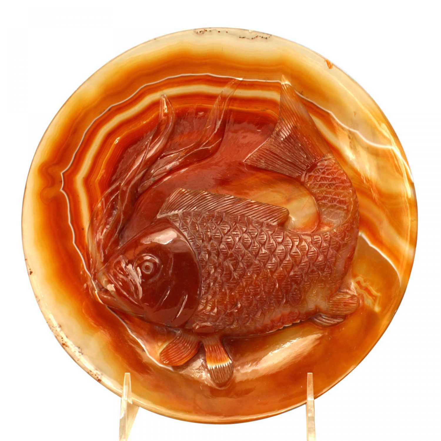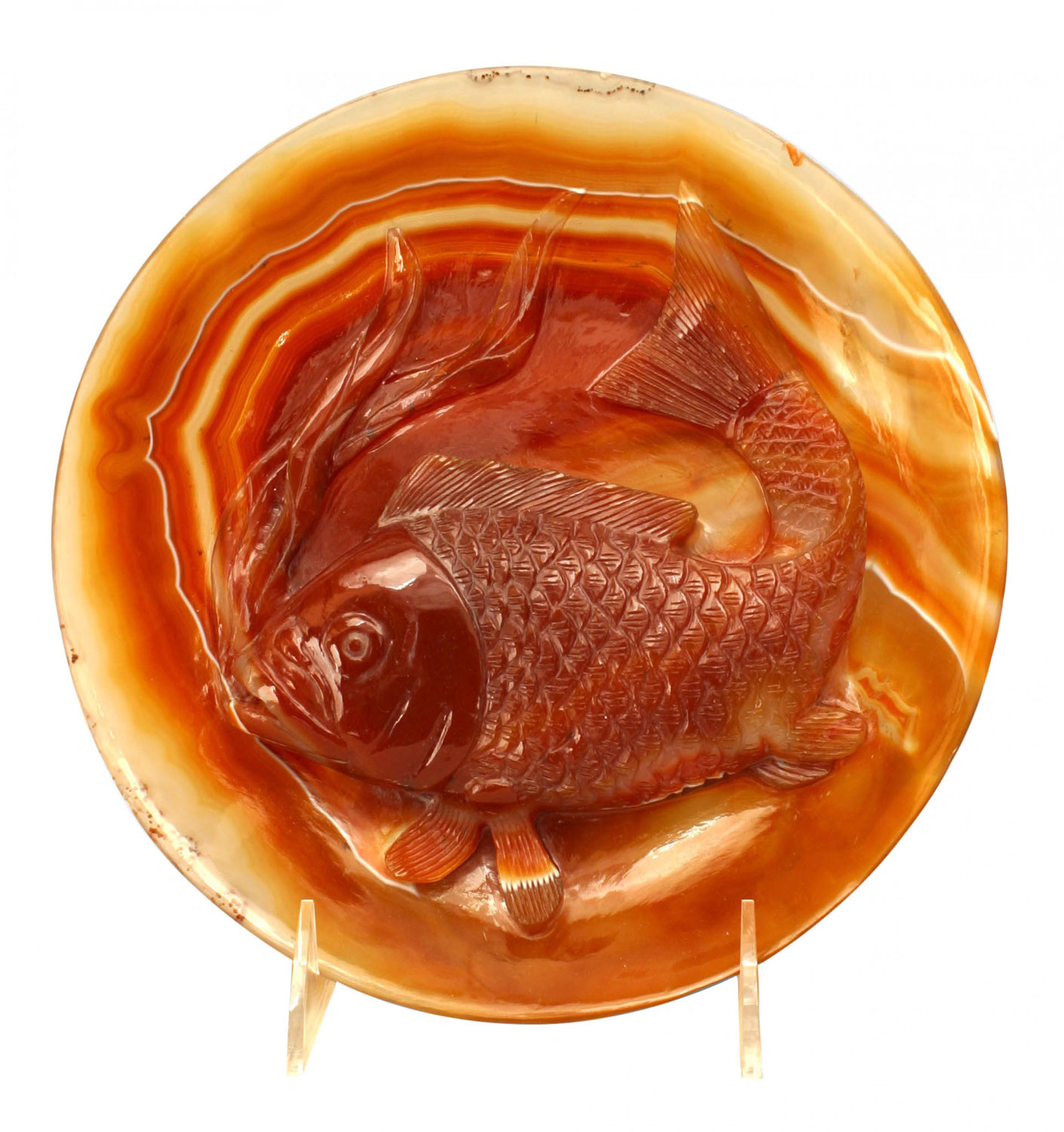Asian Chinese rust agate round plate with a carved fish in relief..