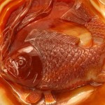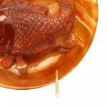 Asian Chinese rust agate round plate with a carved fish in relief.