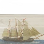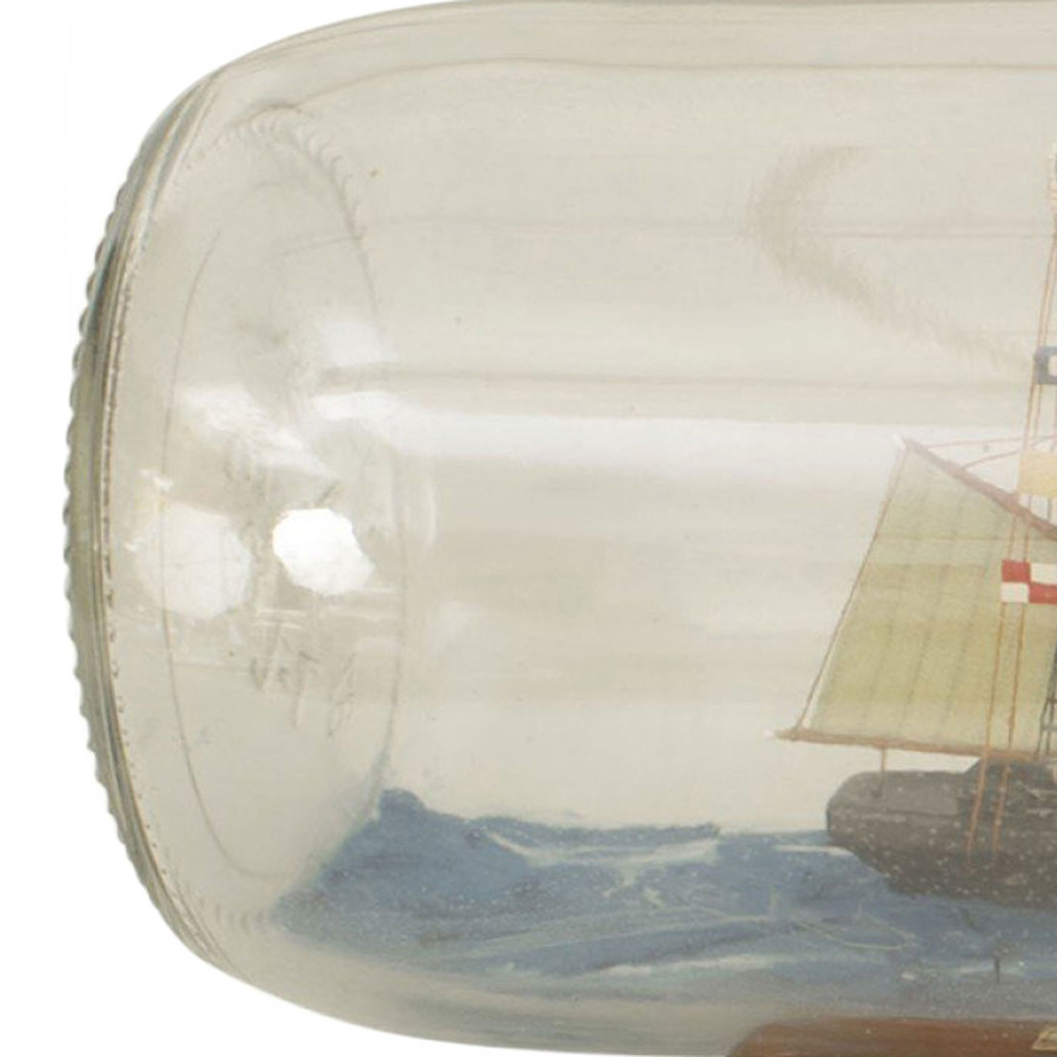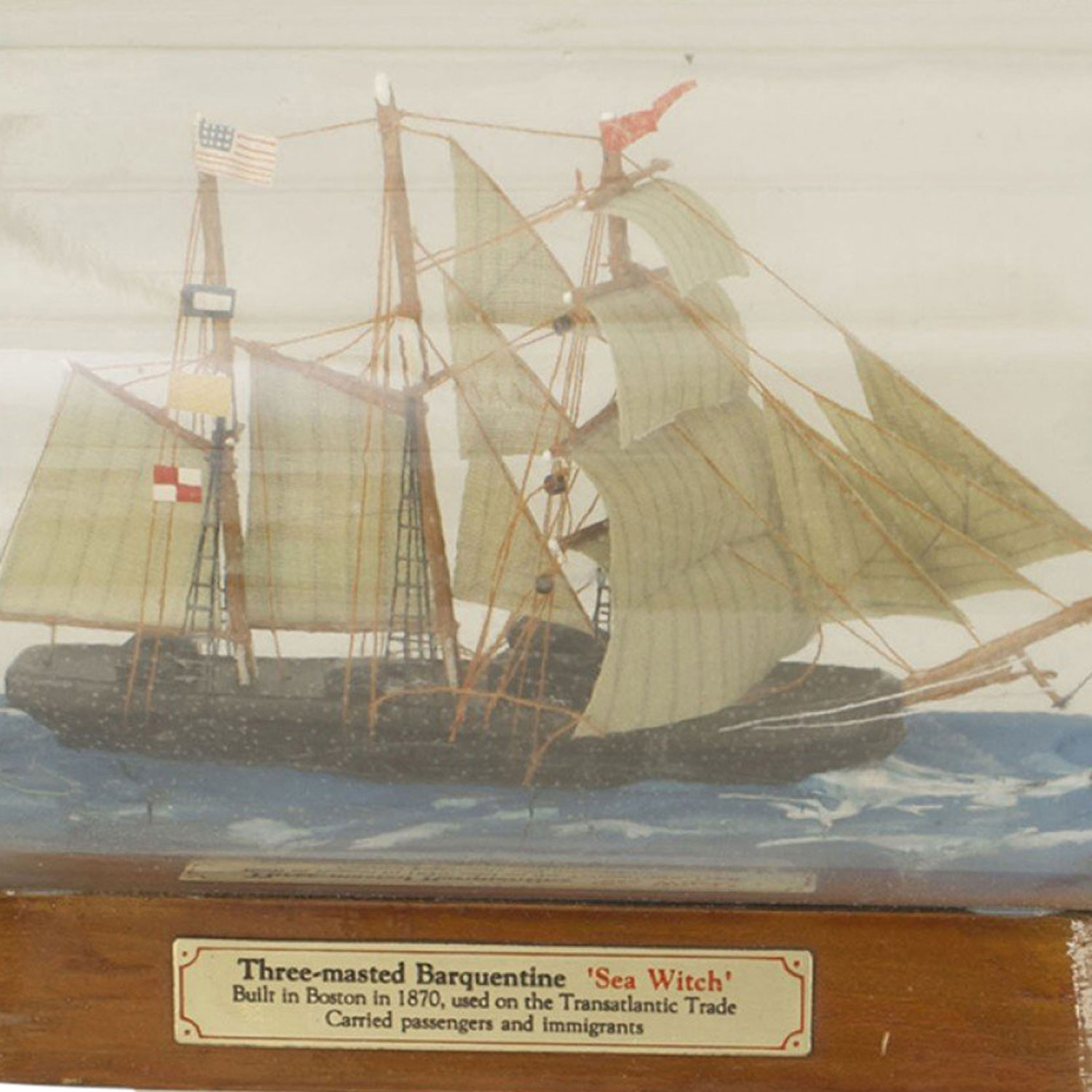 American/English (20th Cent) sailing ship with 3 masts in a glass bottle on a small wood base "SEA WITCH"