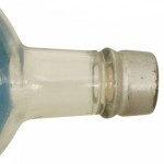 American/English (19/20th Cent) sailing ship with 2 masts in a glass bottle with a blue painted background on a green wood base.