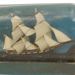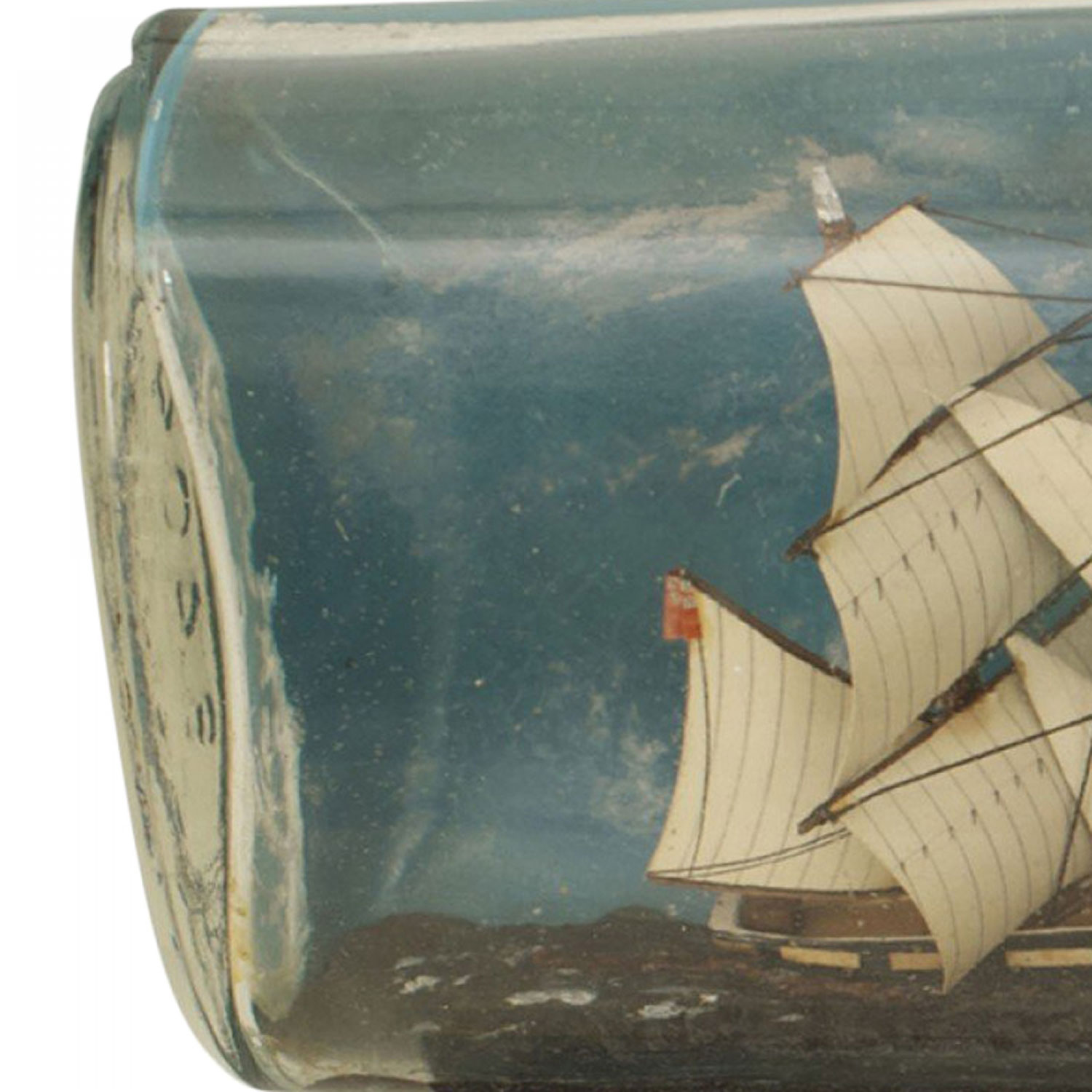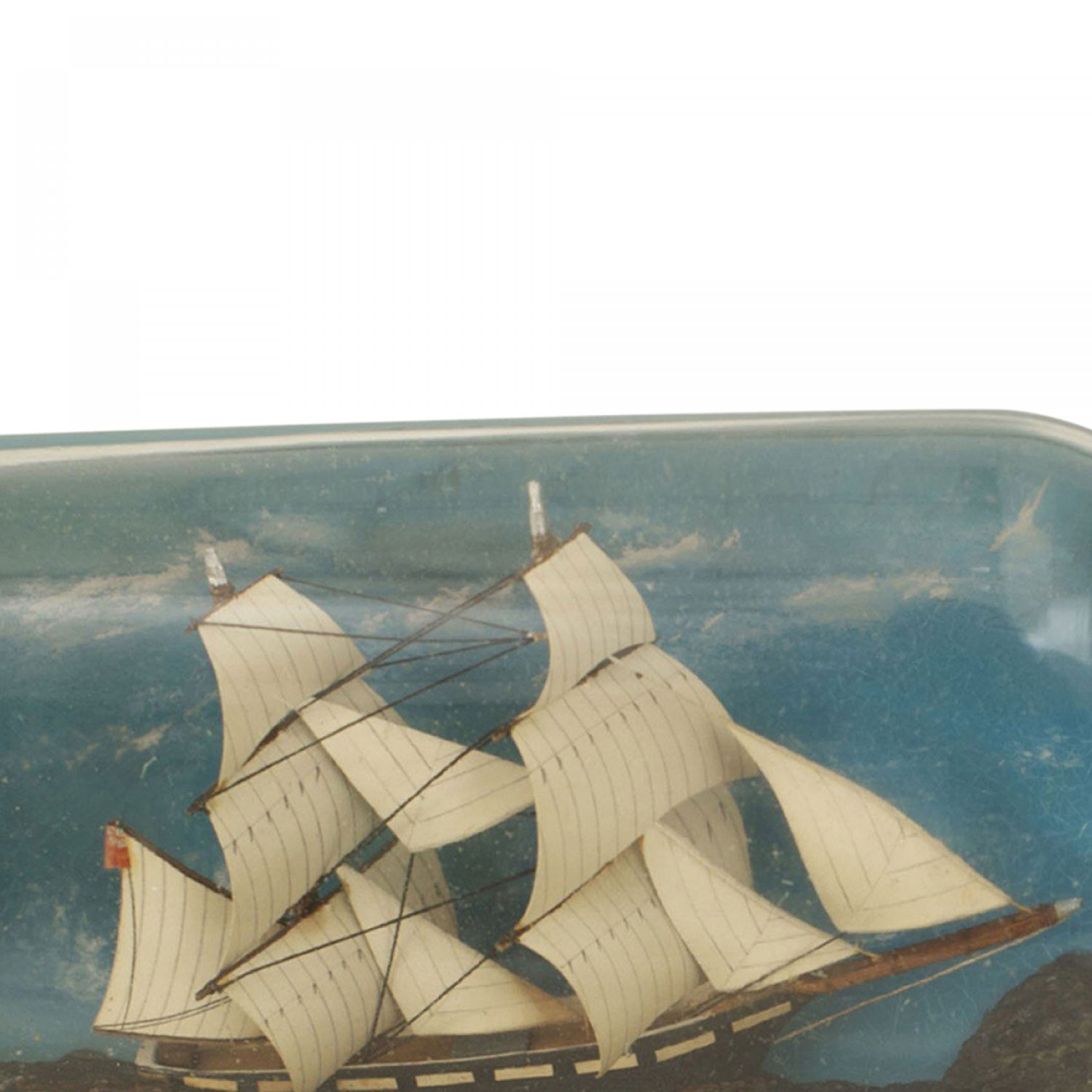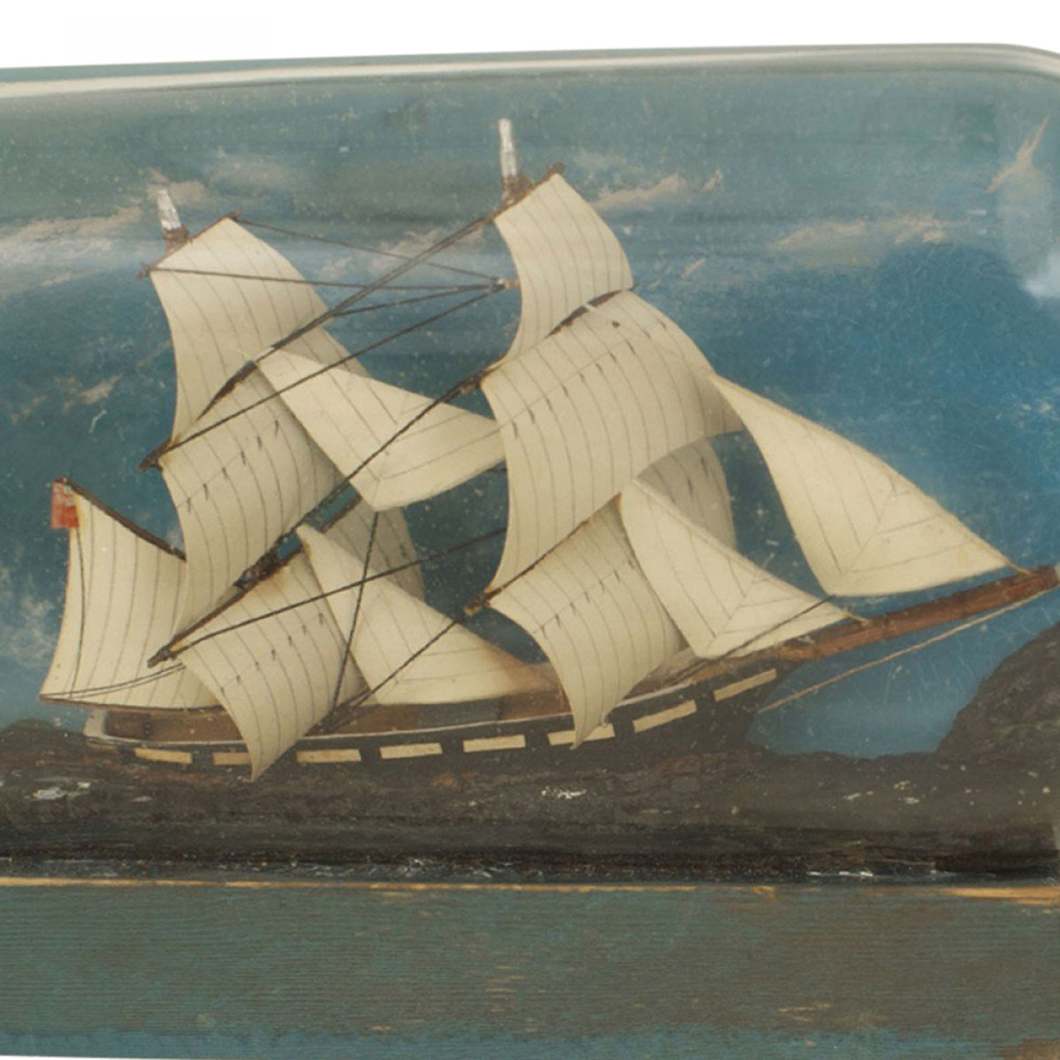 American/English (19/20th Cent) sailing ship with 2 masts in a glass bottle with a blue painted background on a green wood base