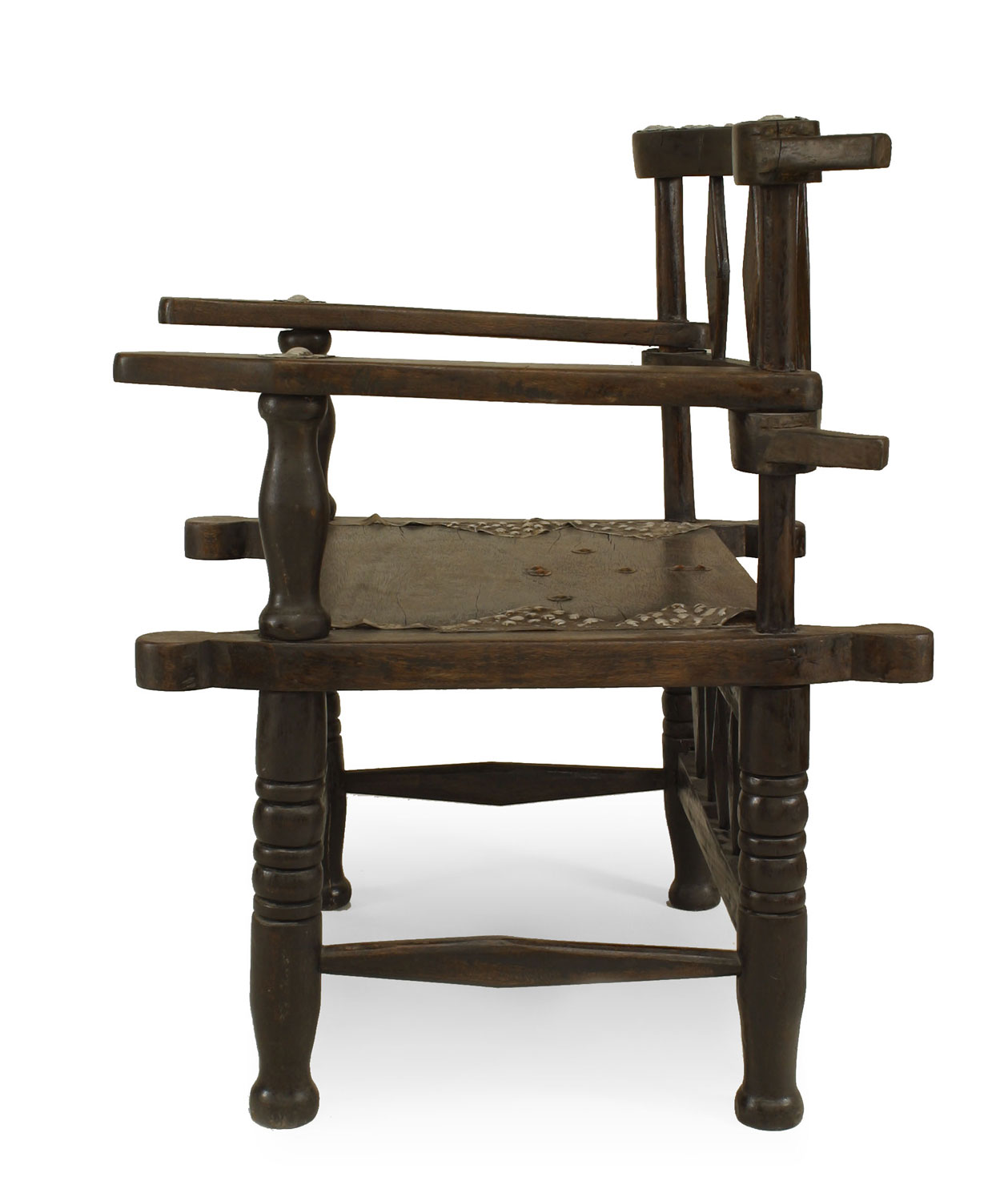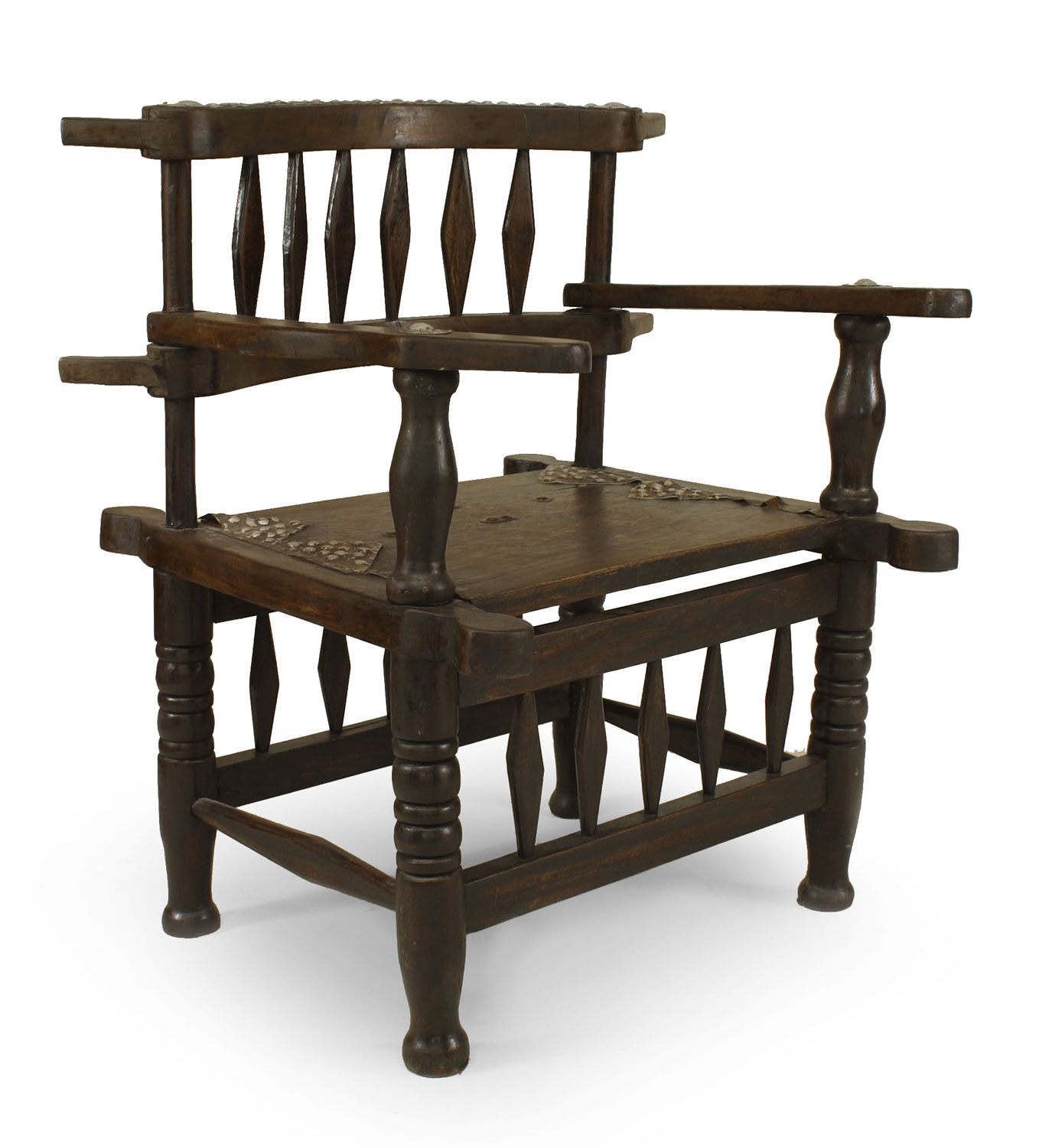PAIR of African hardwood Armchairs with diamond design on back and stretcher trimmed with metal on arms and back.