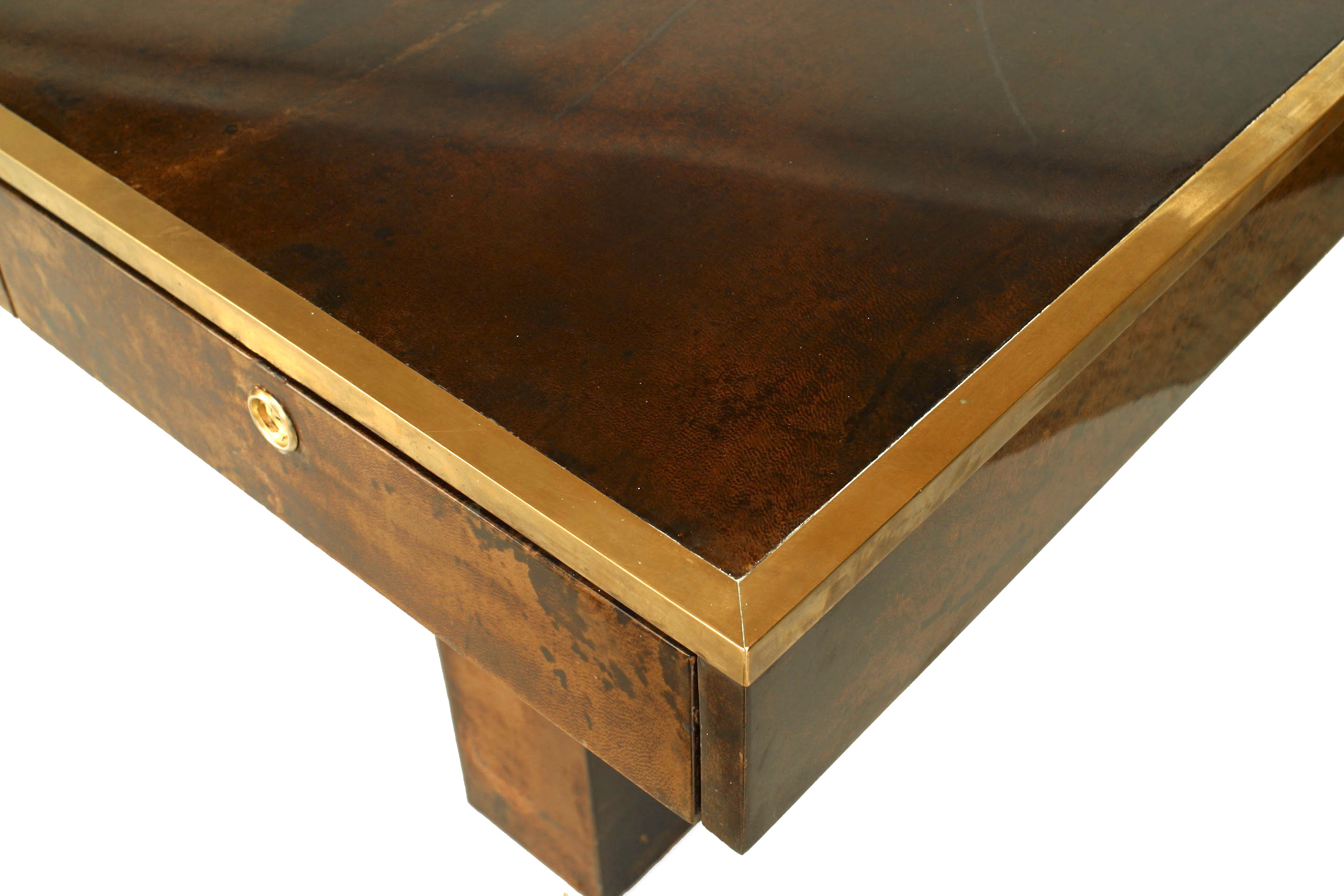 Italian 1940/1950s brown parchment veneer desk with brass trimmed edge and 4 drawers supported on 2 rectangular pedestals with a vanity panel. (ALDO TURA)