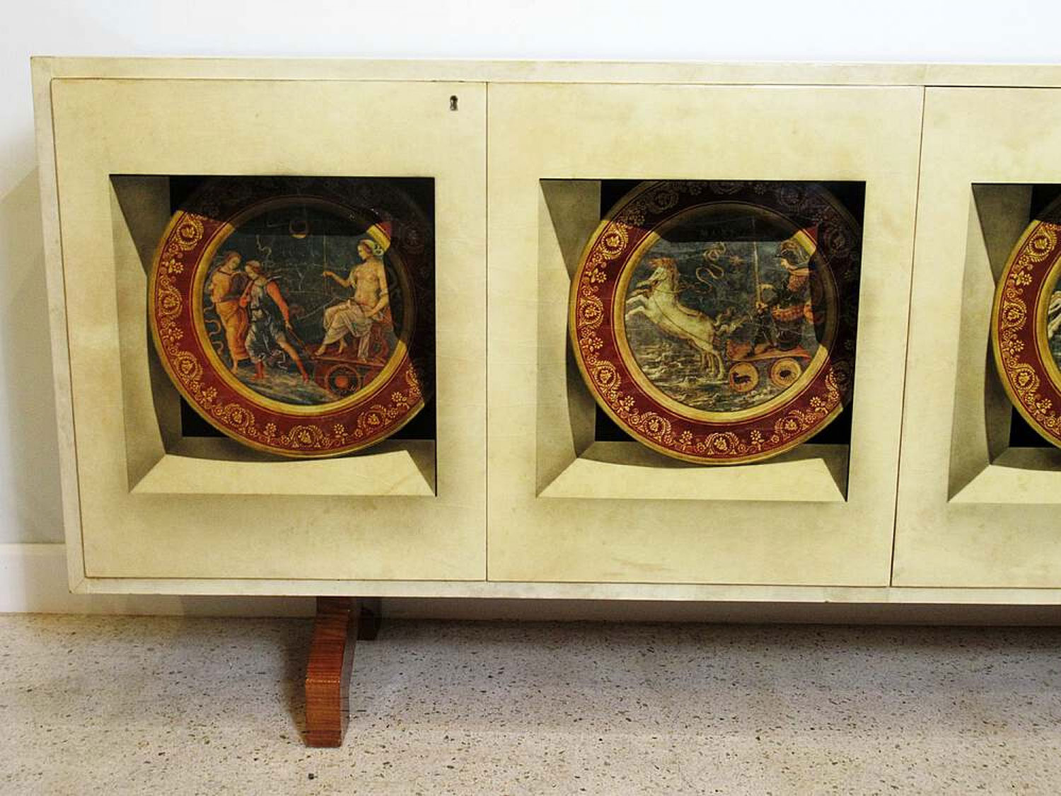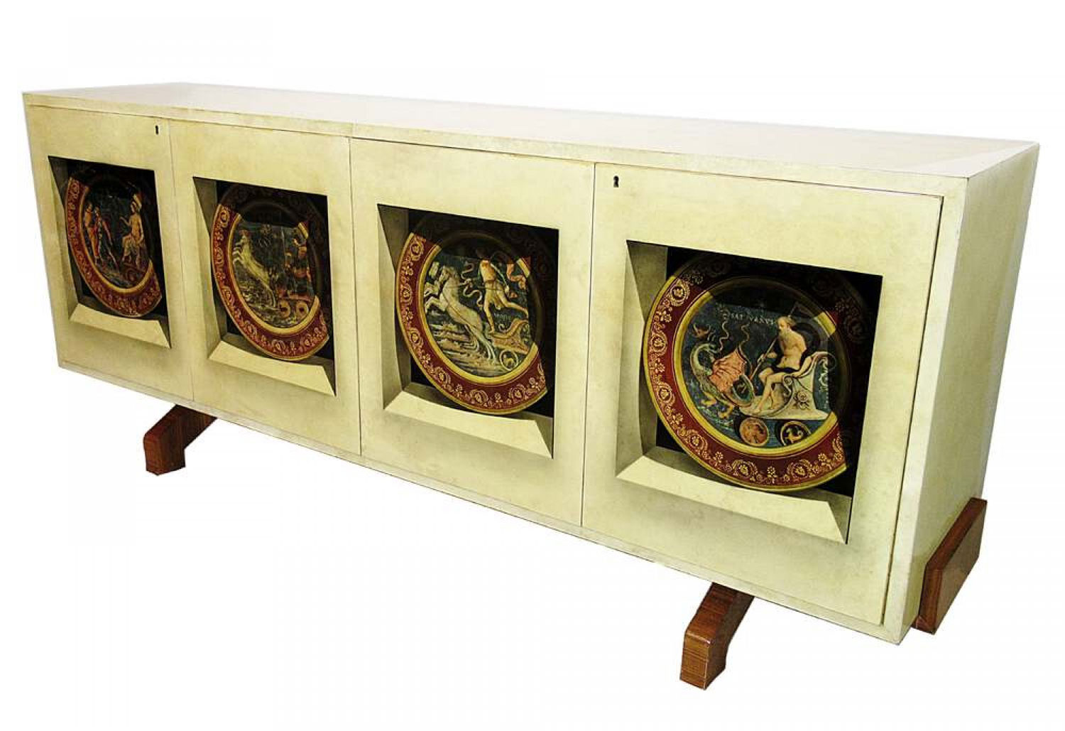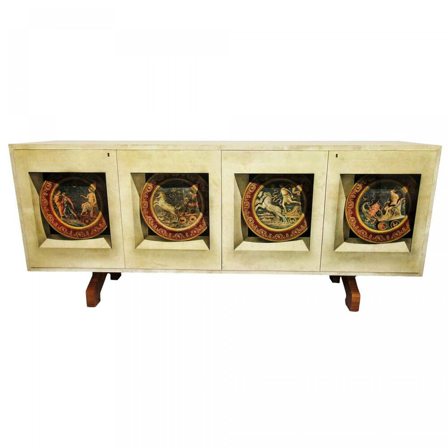 Italian Mid-Century Modern credenza with two double hinged doors, finished in beige parchment with trompe l'oeil inset designs on the doors. (ALDO TURA).