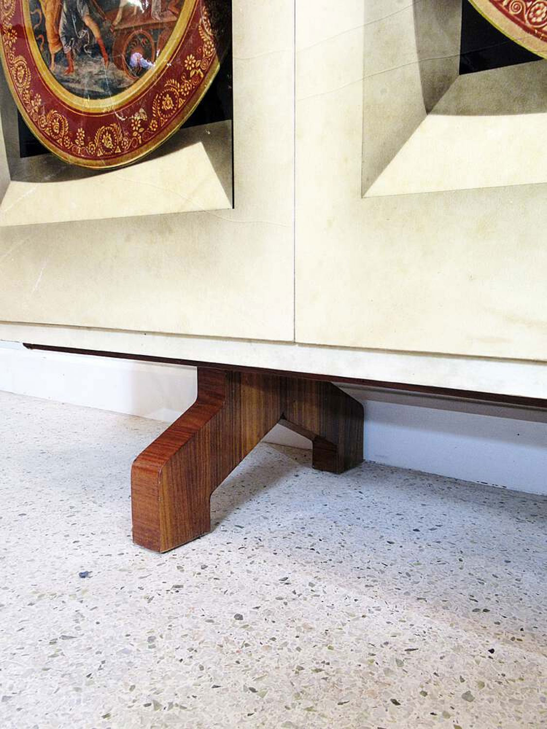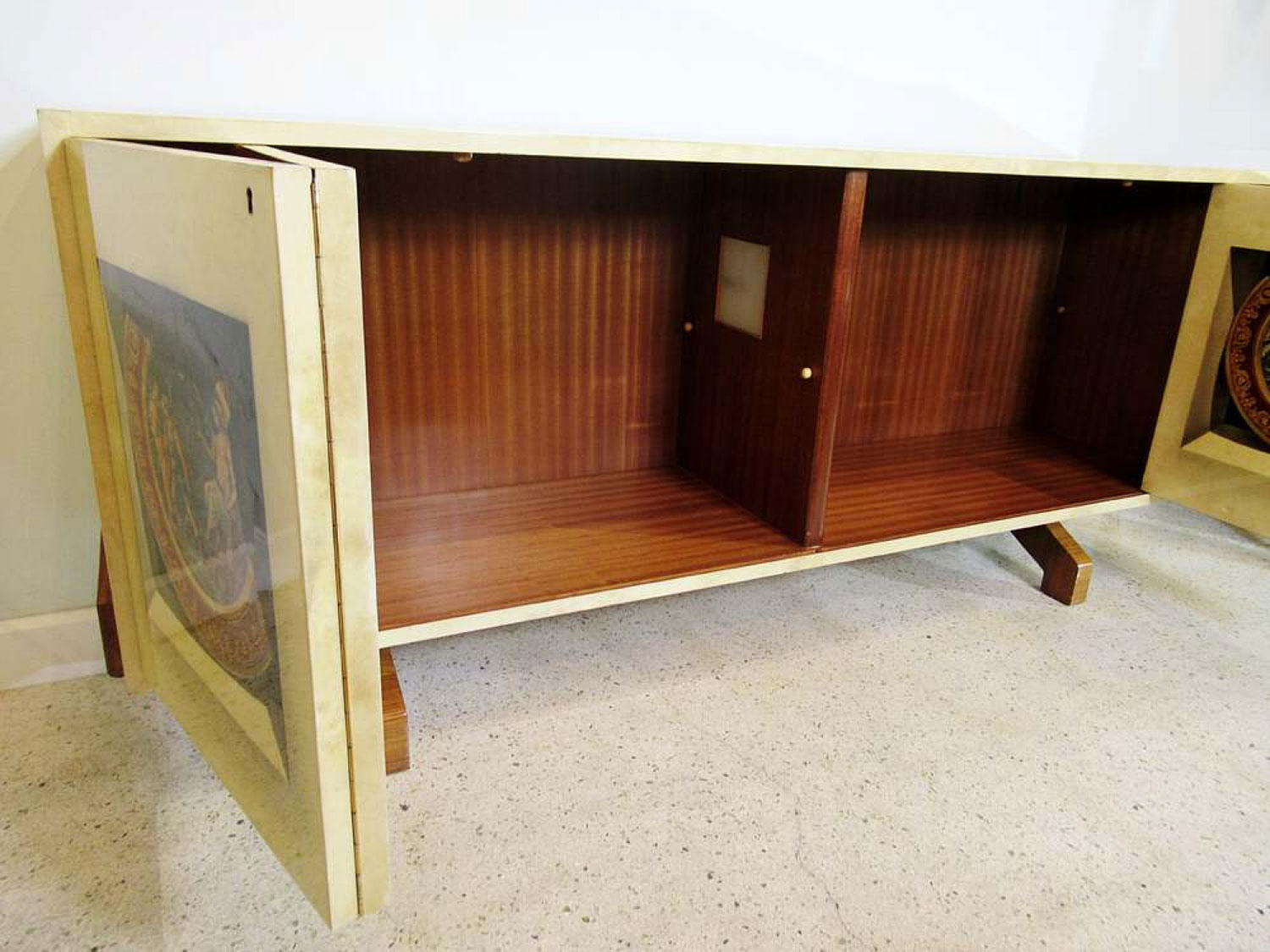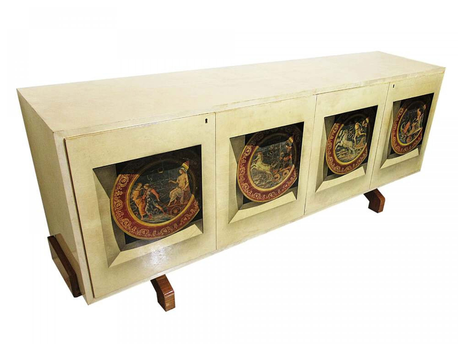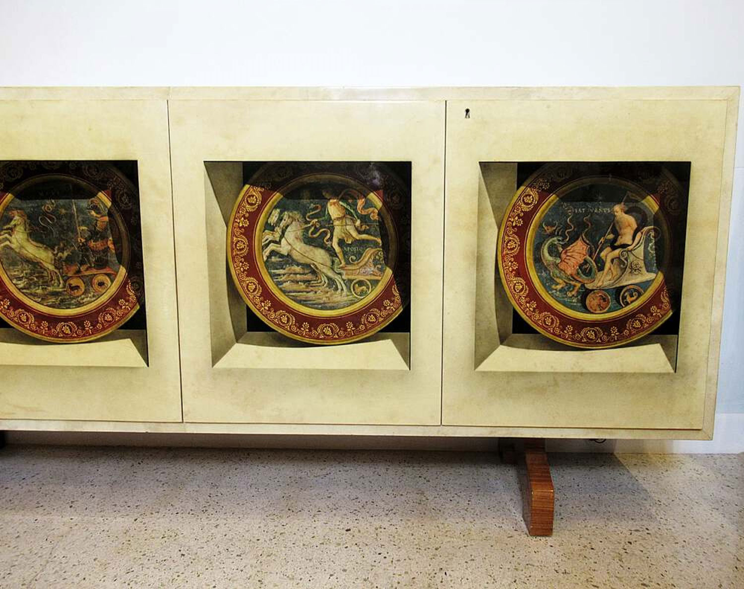 Italian Mid-Century Modern credenza with two double hinged doors, finished in beige parchment with trompe l'oeil inset designs on the doors. (ALDO TURA).