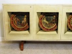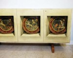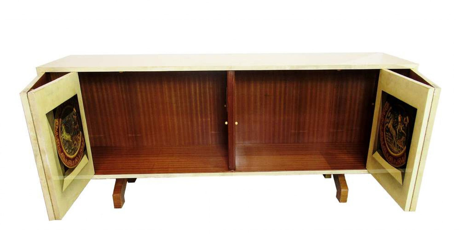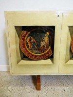 Italian Mid-Century Modern credenza with two double hinged doors, finished in beige parchment with trompe l'oeil inset designs on the doors. (ALDO TURA)