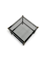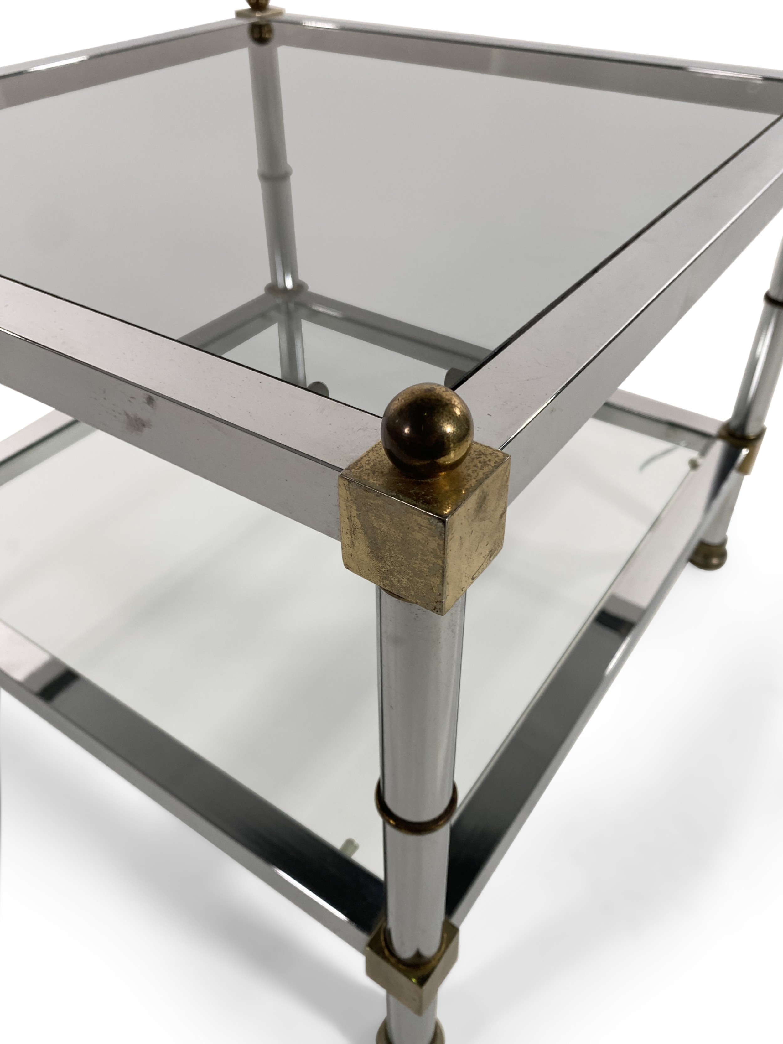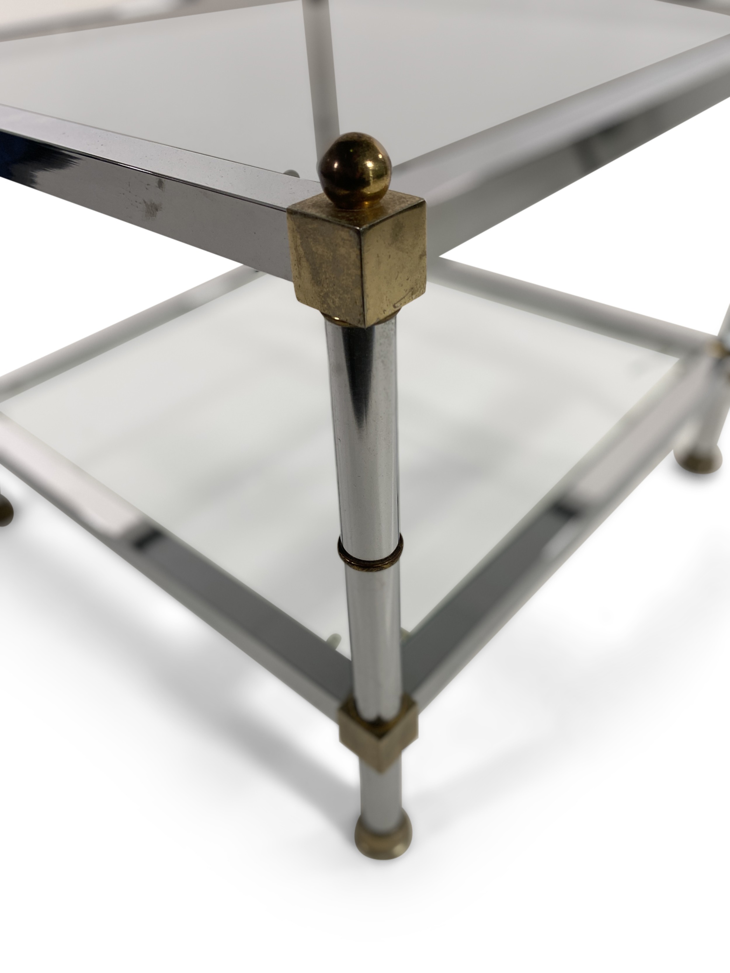 PAIR of American Mid-Century two-tier chrome and glass square end tables featuring brass accents on the corners (possibly MAISON JANSEN) (PRICED AS PAIR)