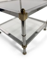 PAIR of American Mid-Century two-tier chrome and glass square end tables featuring brass accents on the corners (possibly MAISON JANSEN) (PRICED AS PAIR).