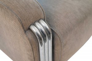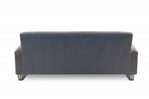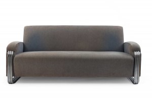 American Art Deco three seat sofa with gray/blue upholstery and chrome accents (att; KEM WEBER).