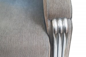 American Art Deco three seat sofa with gray/blue upholstery and chrome accents (att; KEM WEBER)