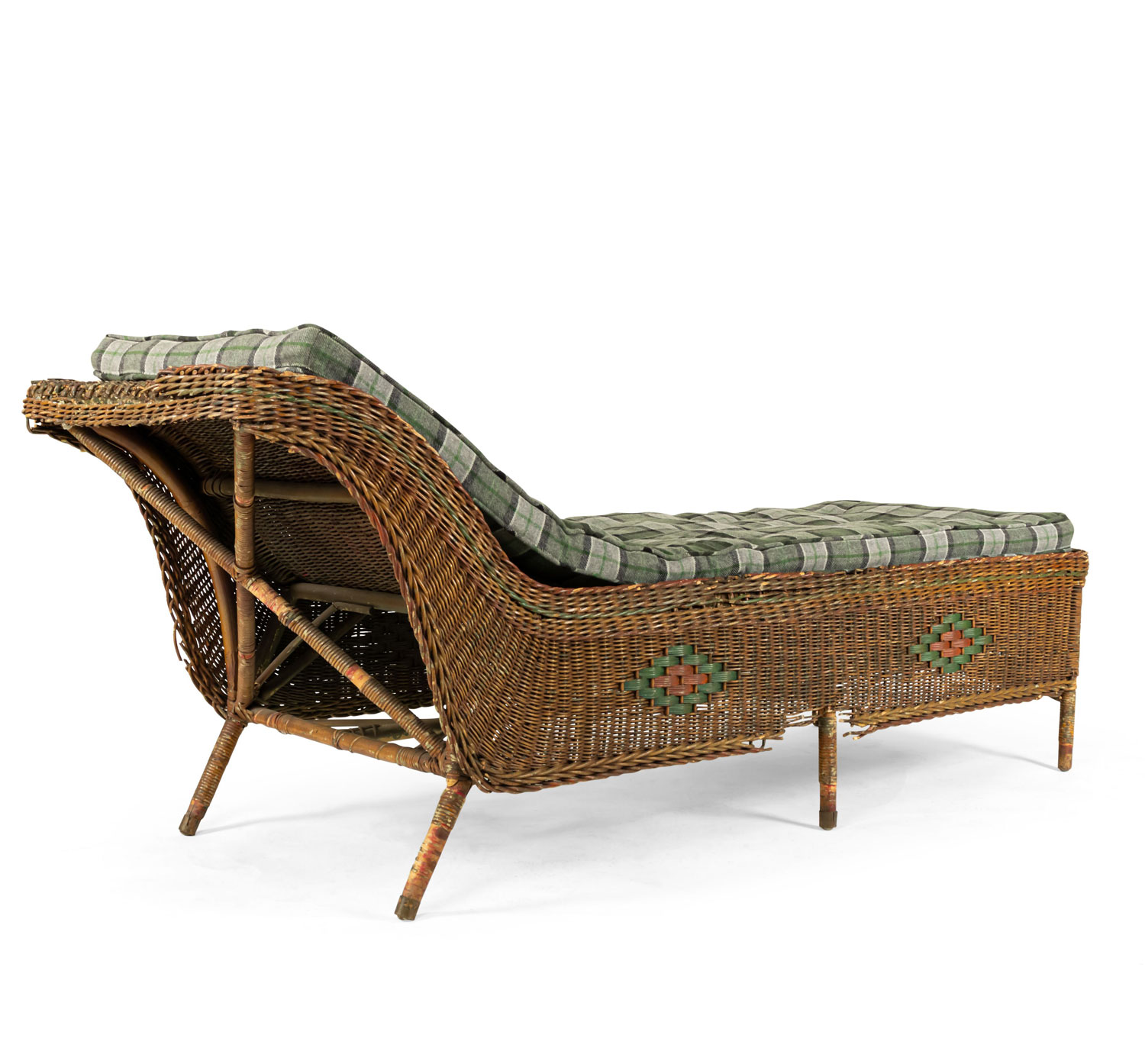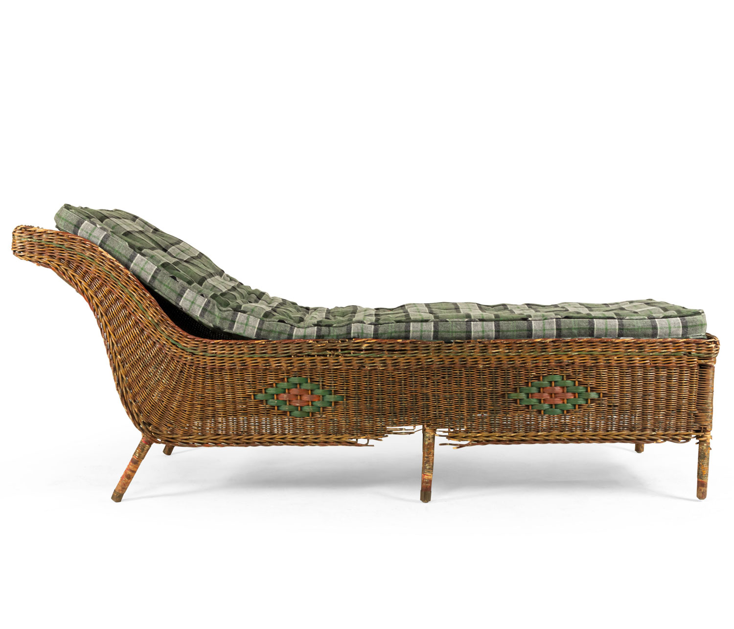 American Art Deco natural wicker backless recamier with red and green painted trim.