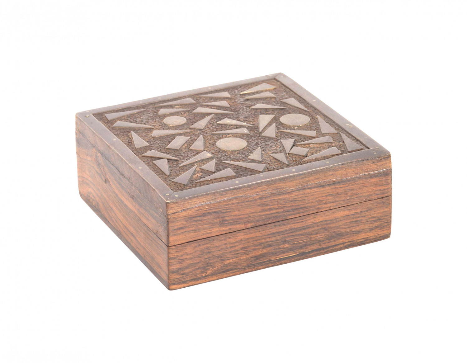 American Art Deco square rosewood box with brass trim and raised brass geometric circles and triangles on lid.