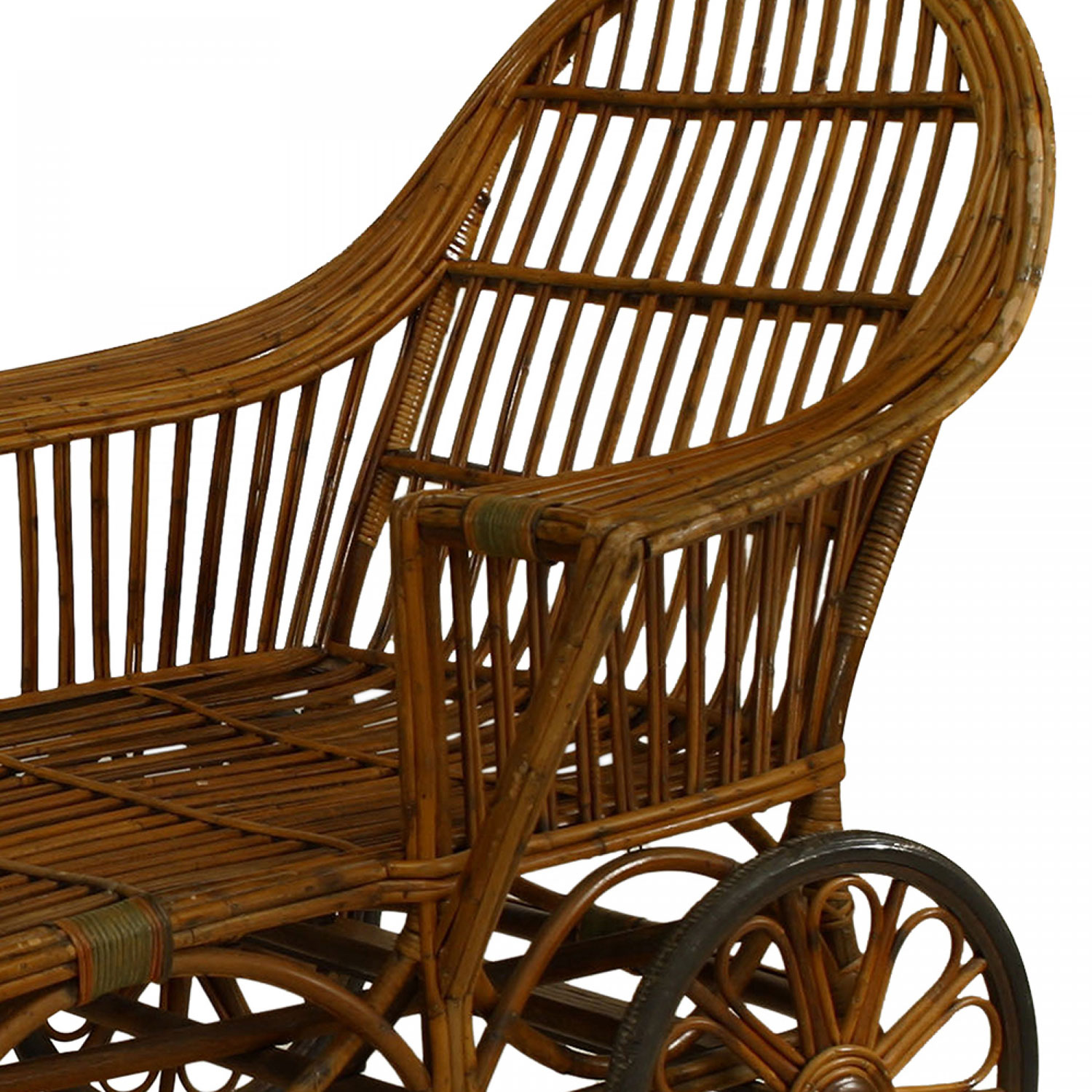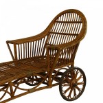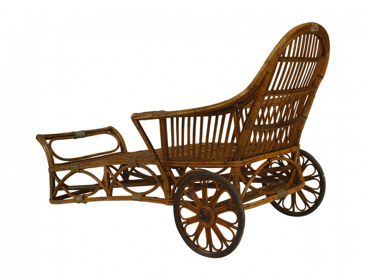 American Art Deco split reed chaise lounge with a rounded back and painted wicker wrapping with 2 large back wheels.