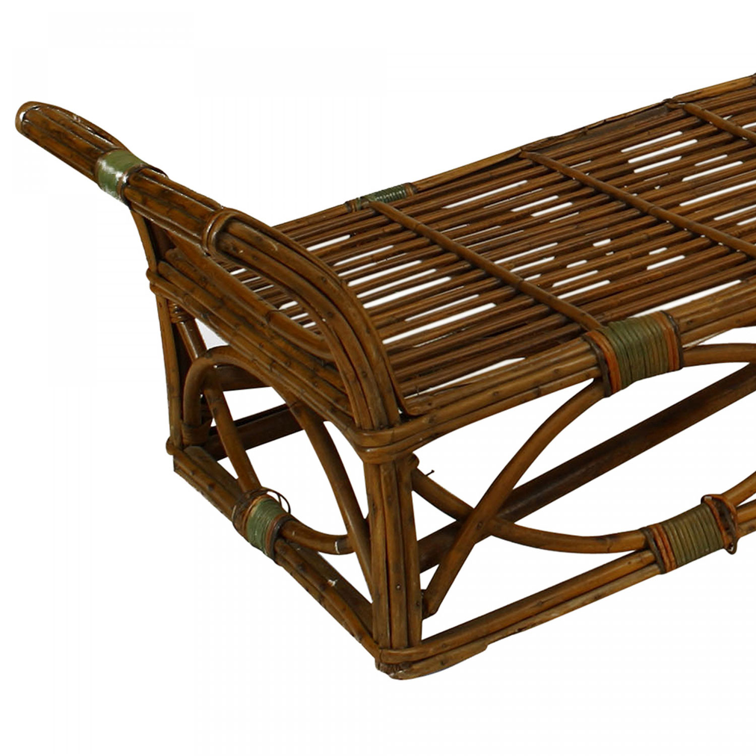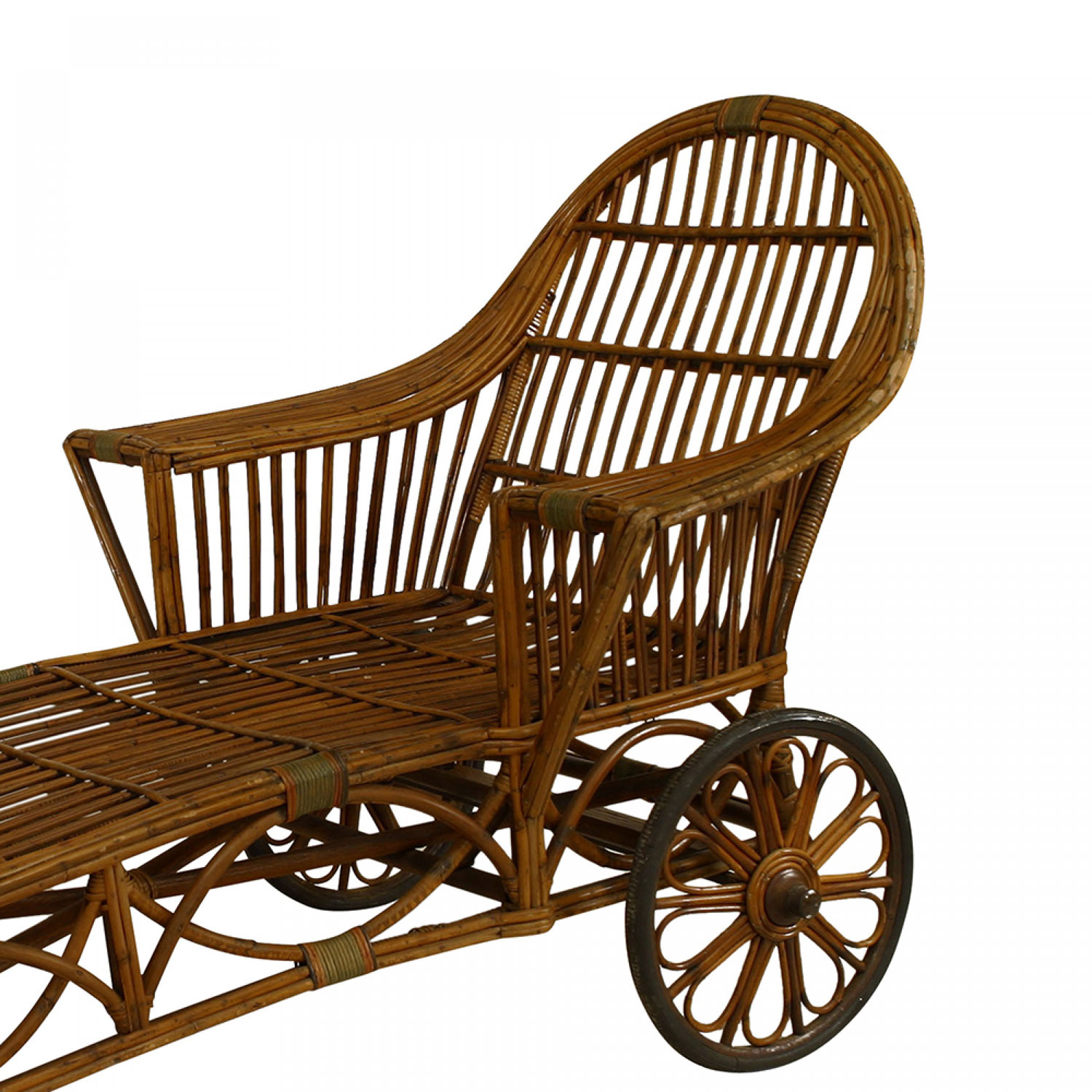 American Art Deco split reed chaise lounge with a rounded back and painted wicker wrapping with 2 large back wheels