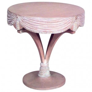 American Art Moderne bleached maple end table with circular top above a swag and tassel carved apron and scrolling uprights. (Attributed to GROSFELD HOUSE).