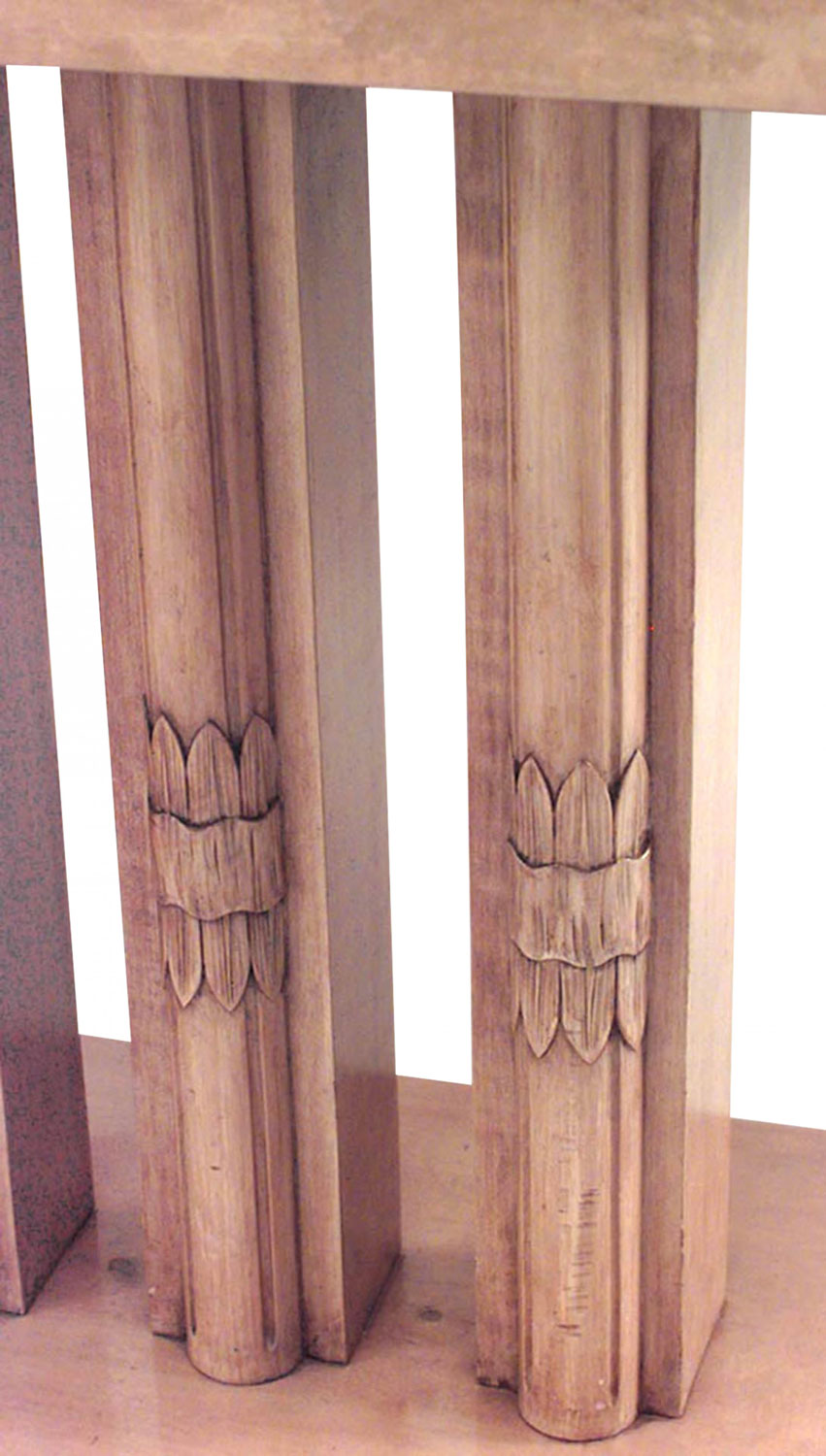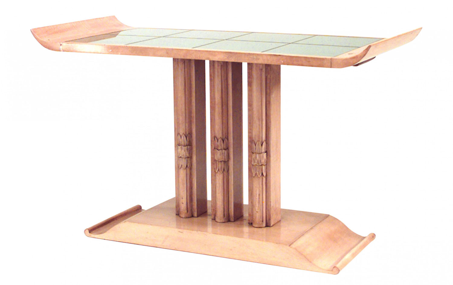 American Art Moderne rectangular sycamore high coffee table with carved triple column pedestal base and eight mirrored panels on top. (attributed to: T.H. ROBSJOHN GIBBINGS)