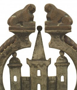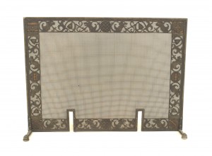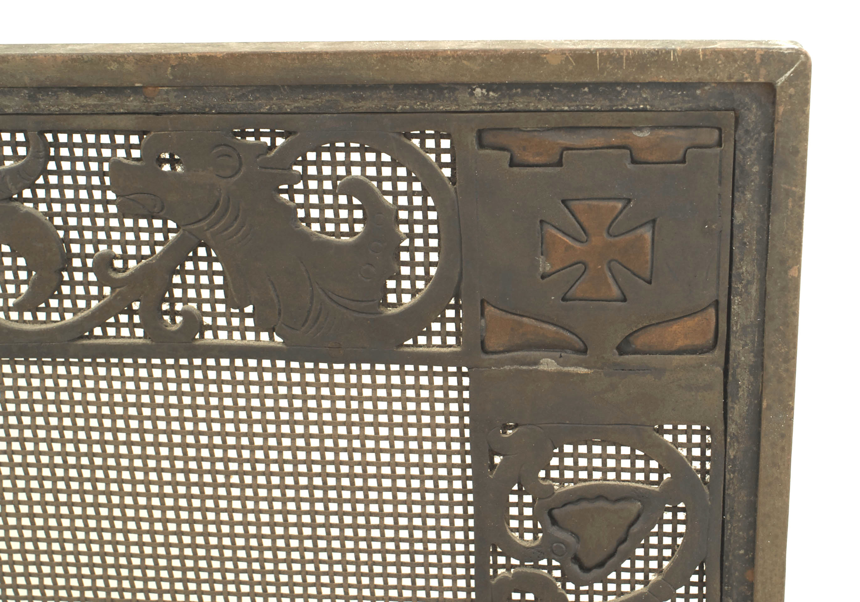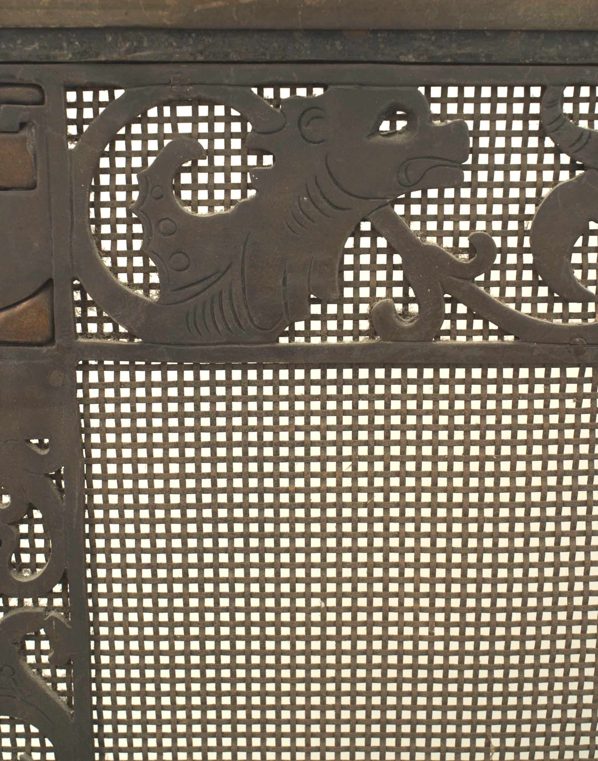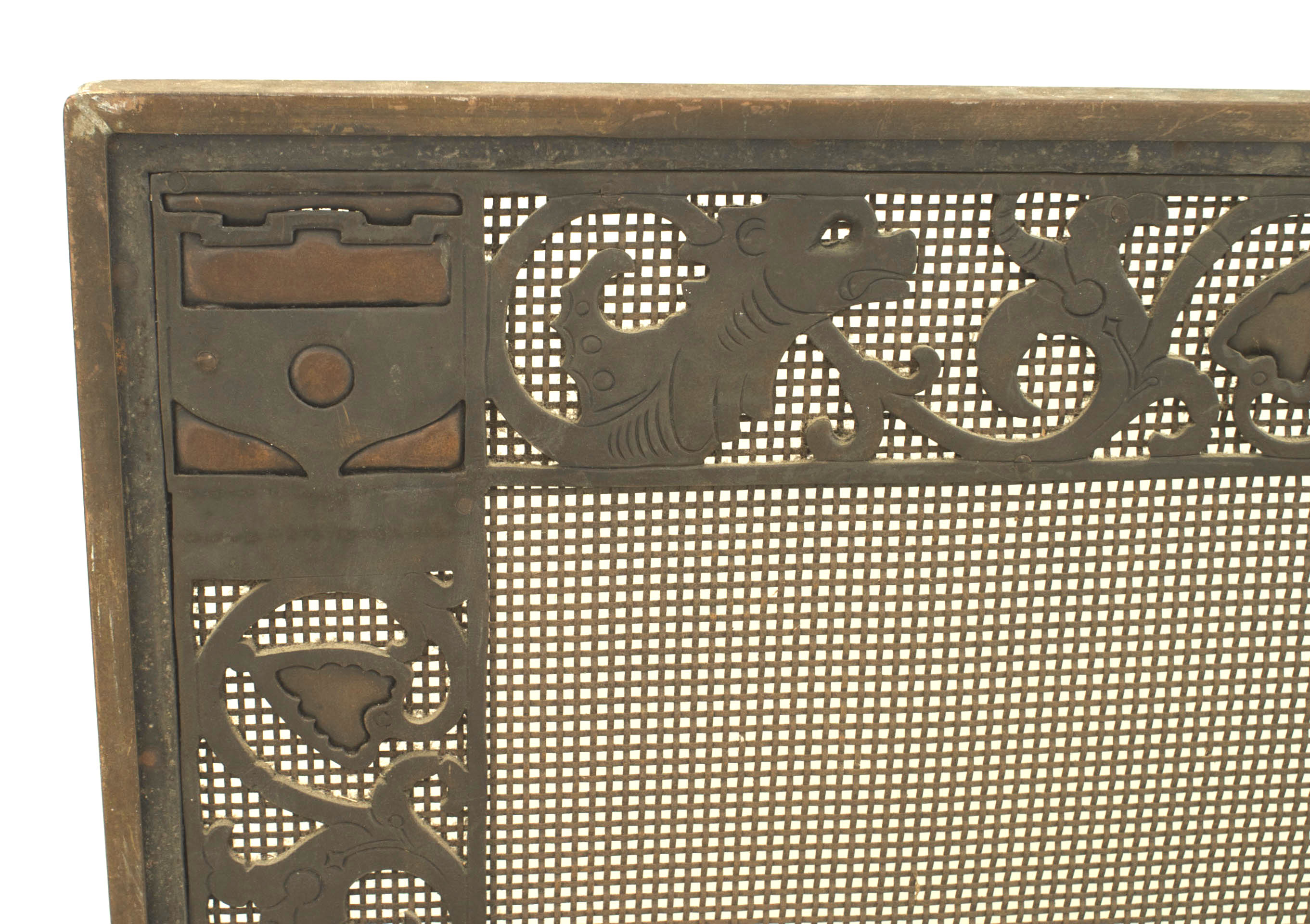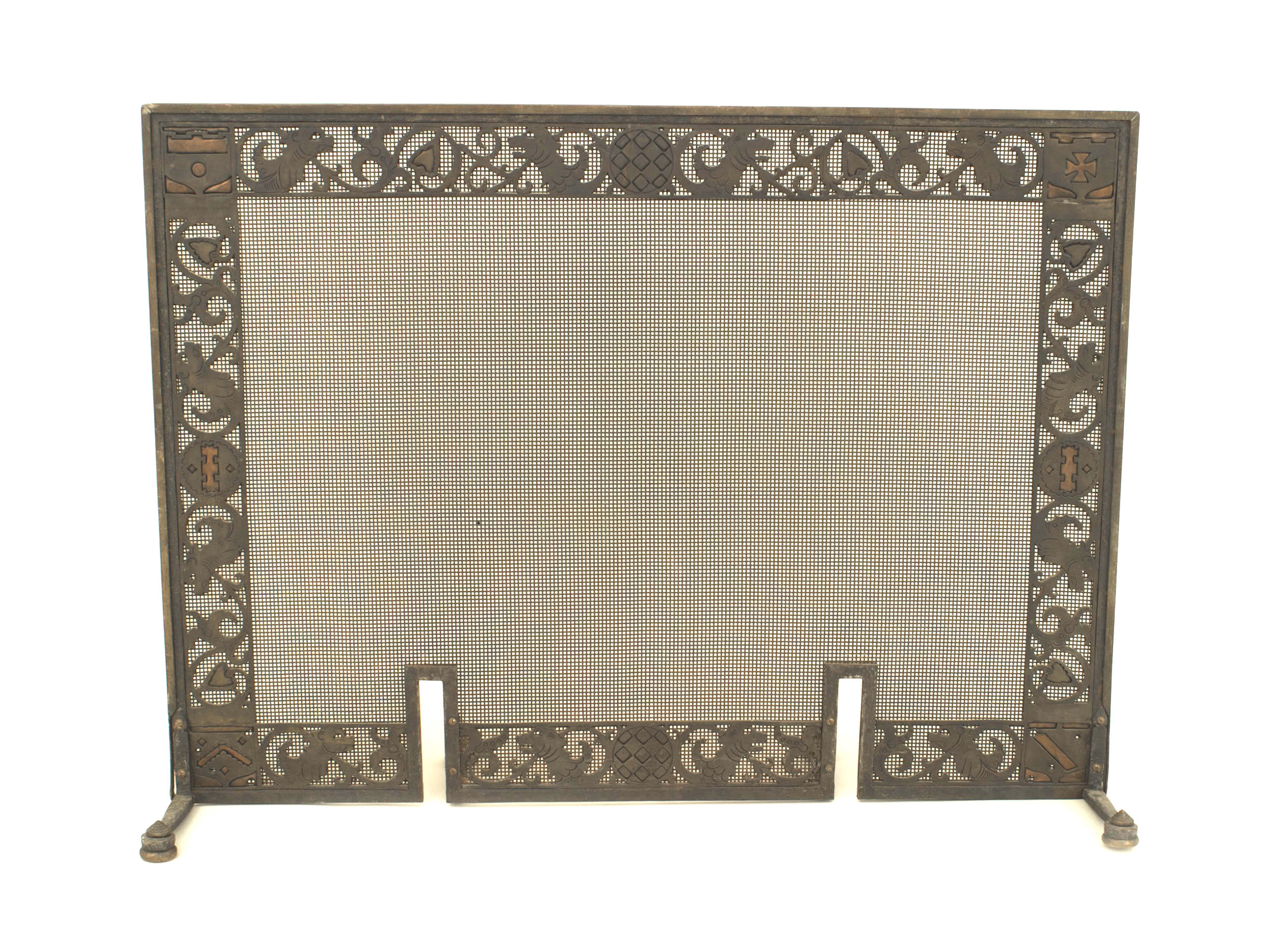American Arts and Crafts wrought iron and bronze fire place andirons and screen with castles and griffins.