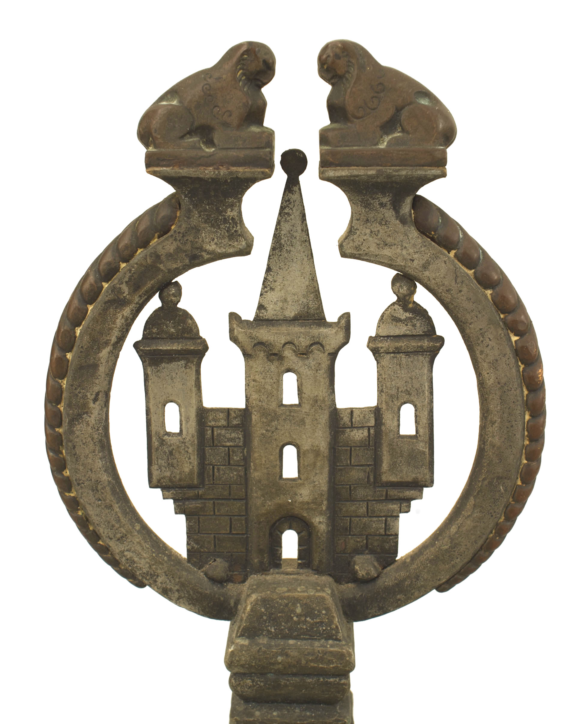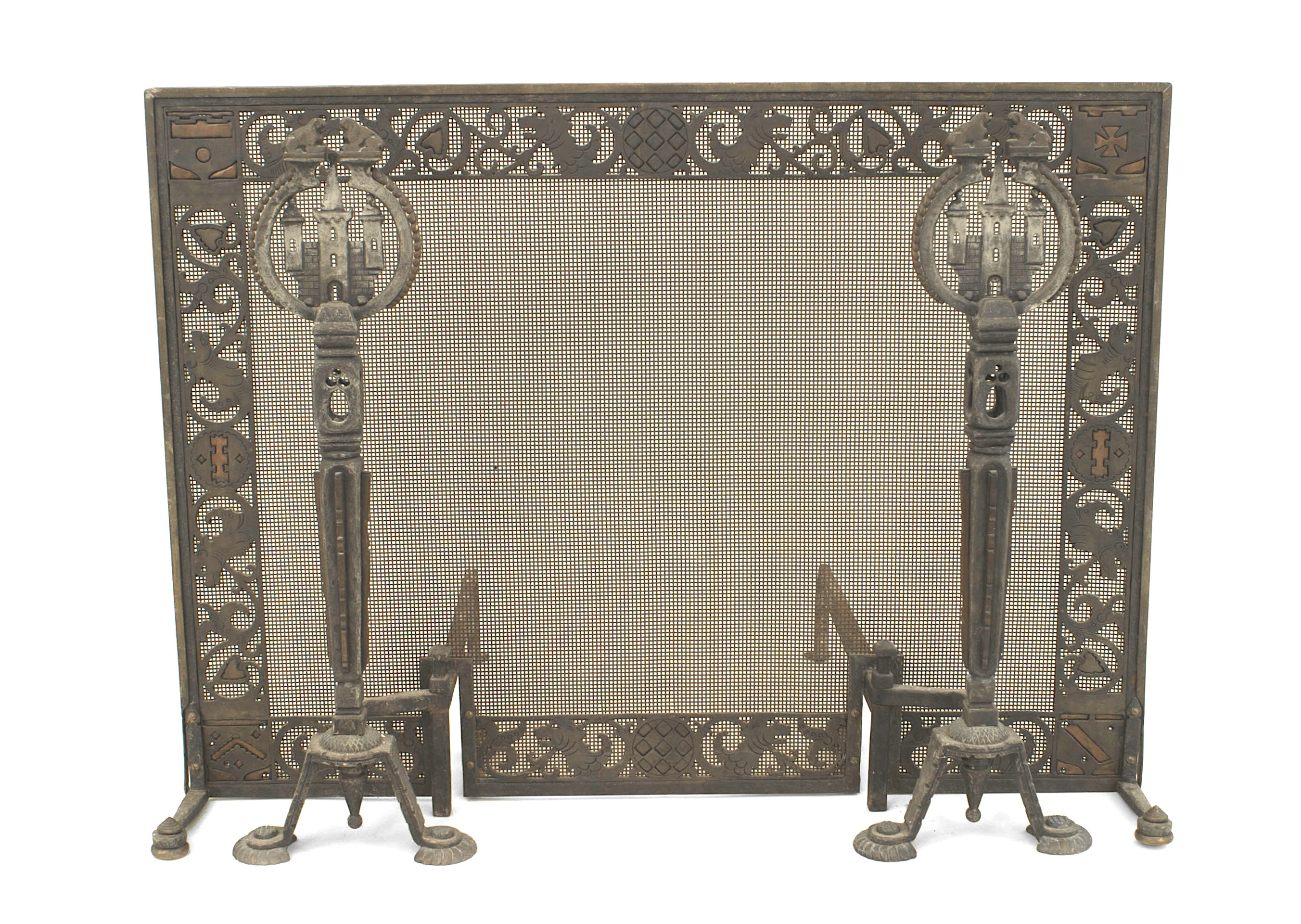 American Arts and Crafts wrought iron and bronze fire place andirons and screen with castles and griffins..