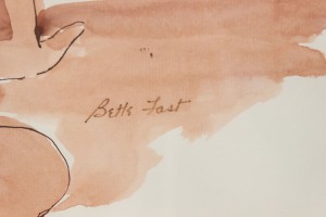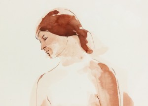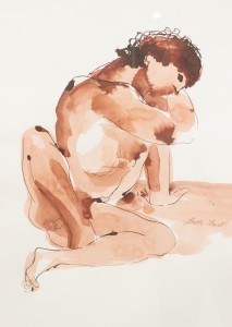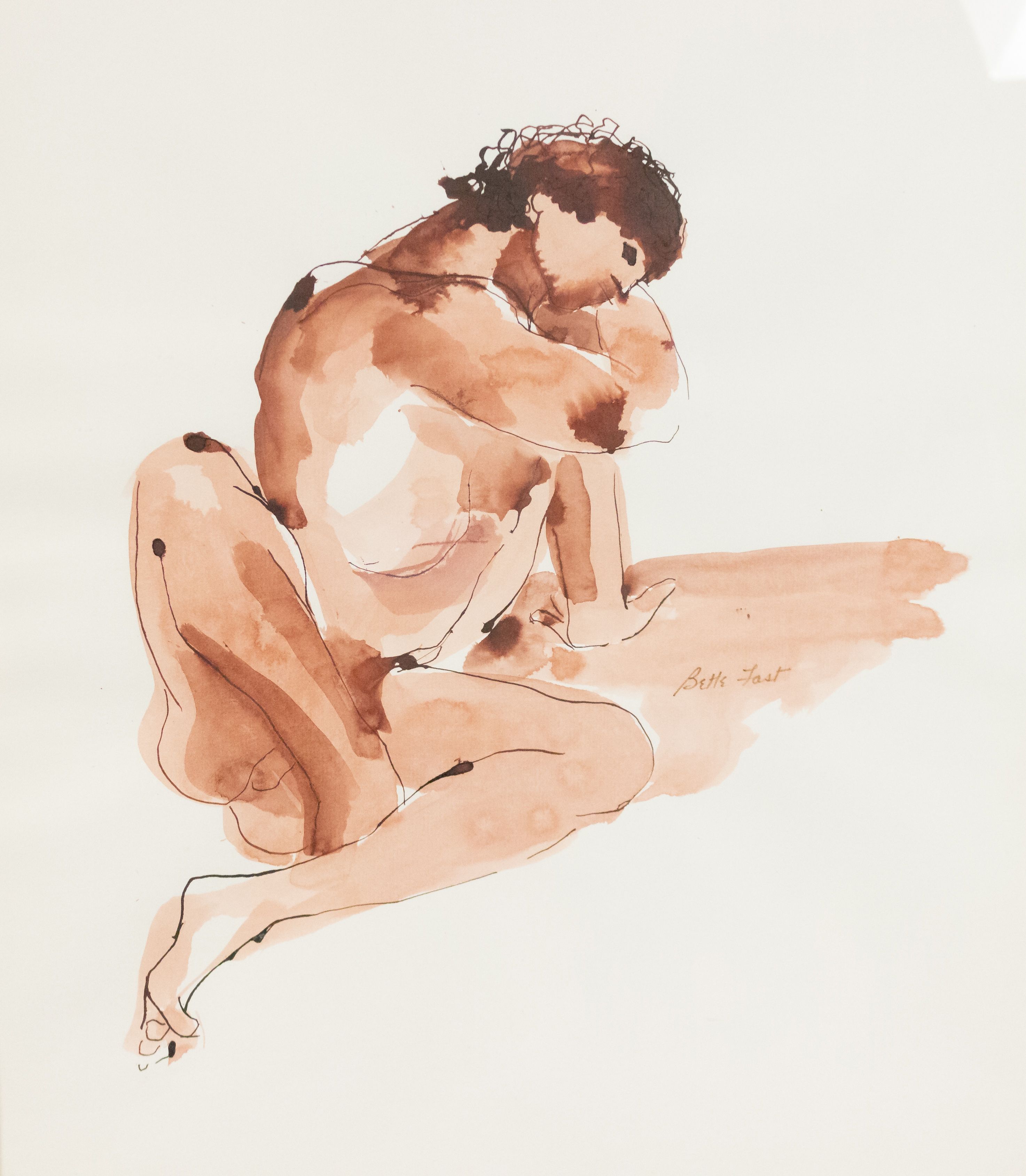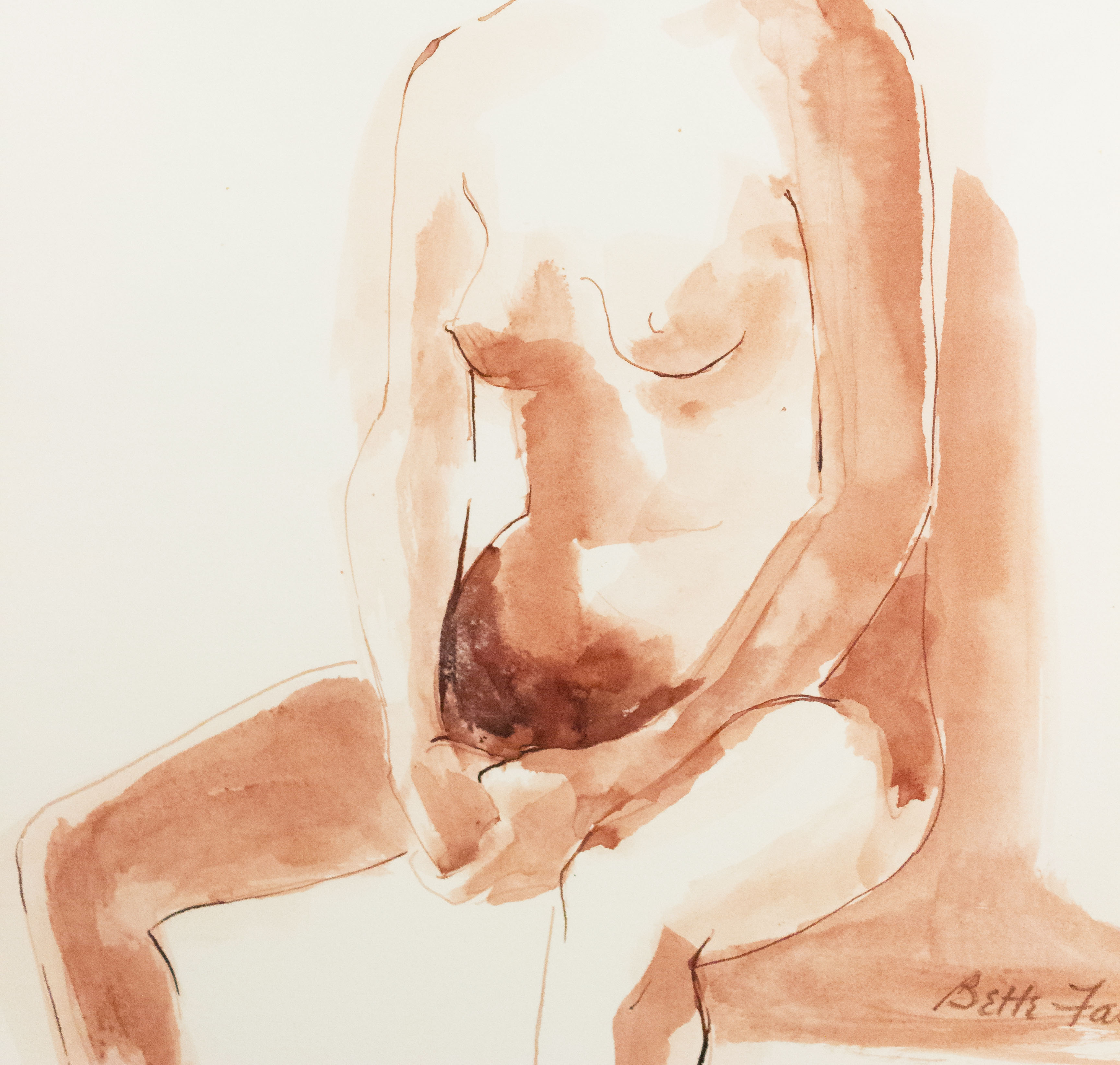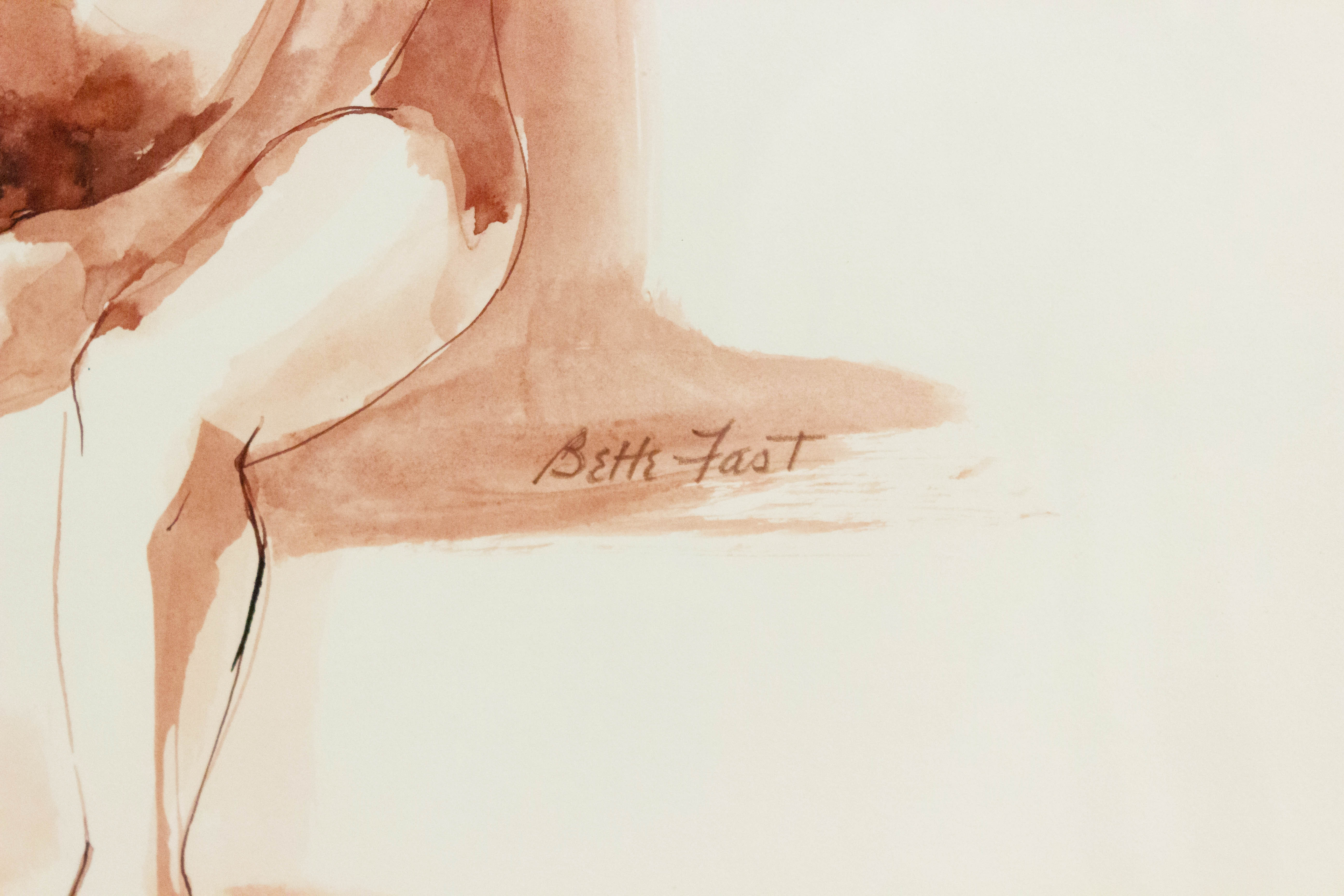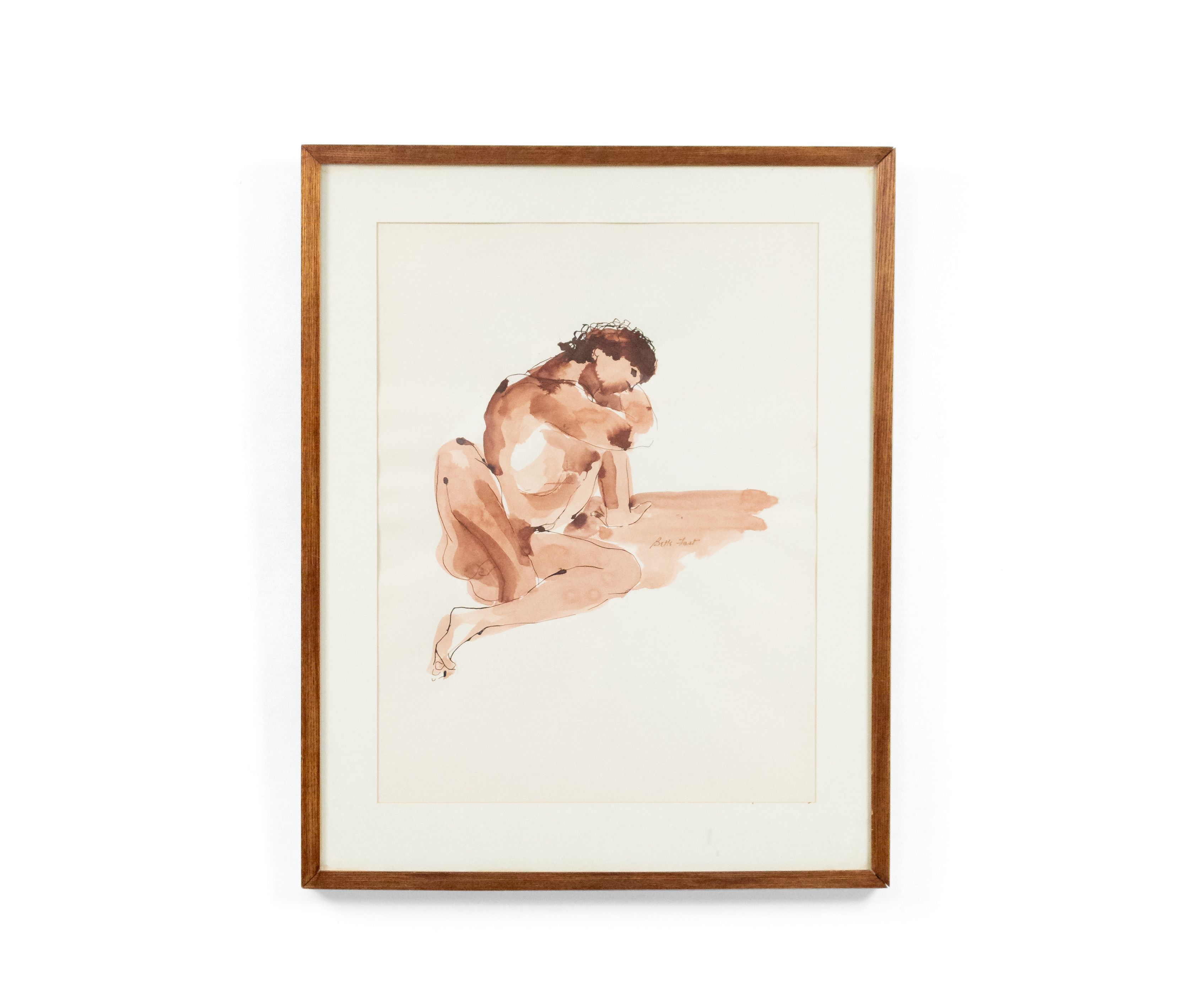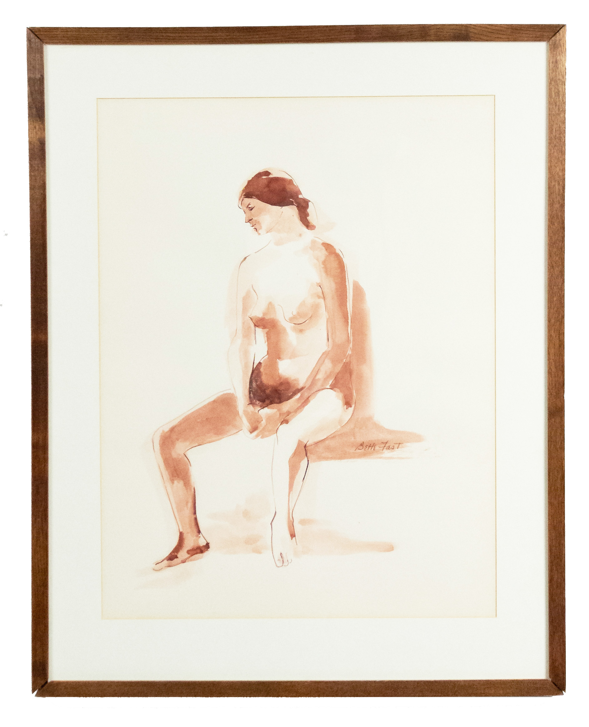2 American Mid 20th Century beige watercolors of nude posing male and female figures in a stained oak frame. (PRICED EACH)
