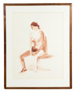 2 American Mid 20th Century beige watercolors of nude posing male and female figures in a stained oak frame. (PRICED EACH).