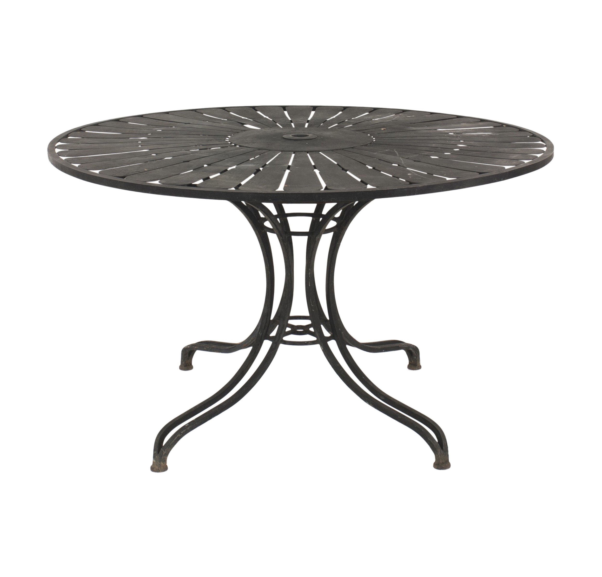 American Mid-Century (1960s) black enameled iron outdoor round dining table with a perforated top (by RUSSELL WOODARD).