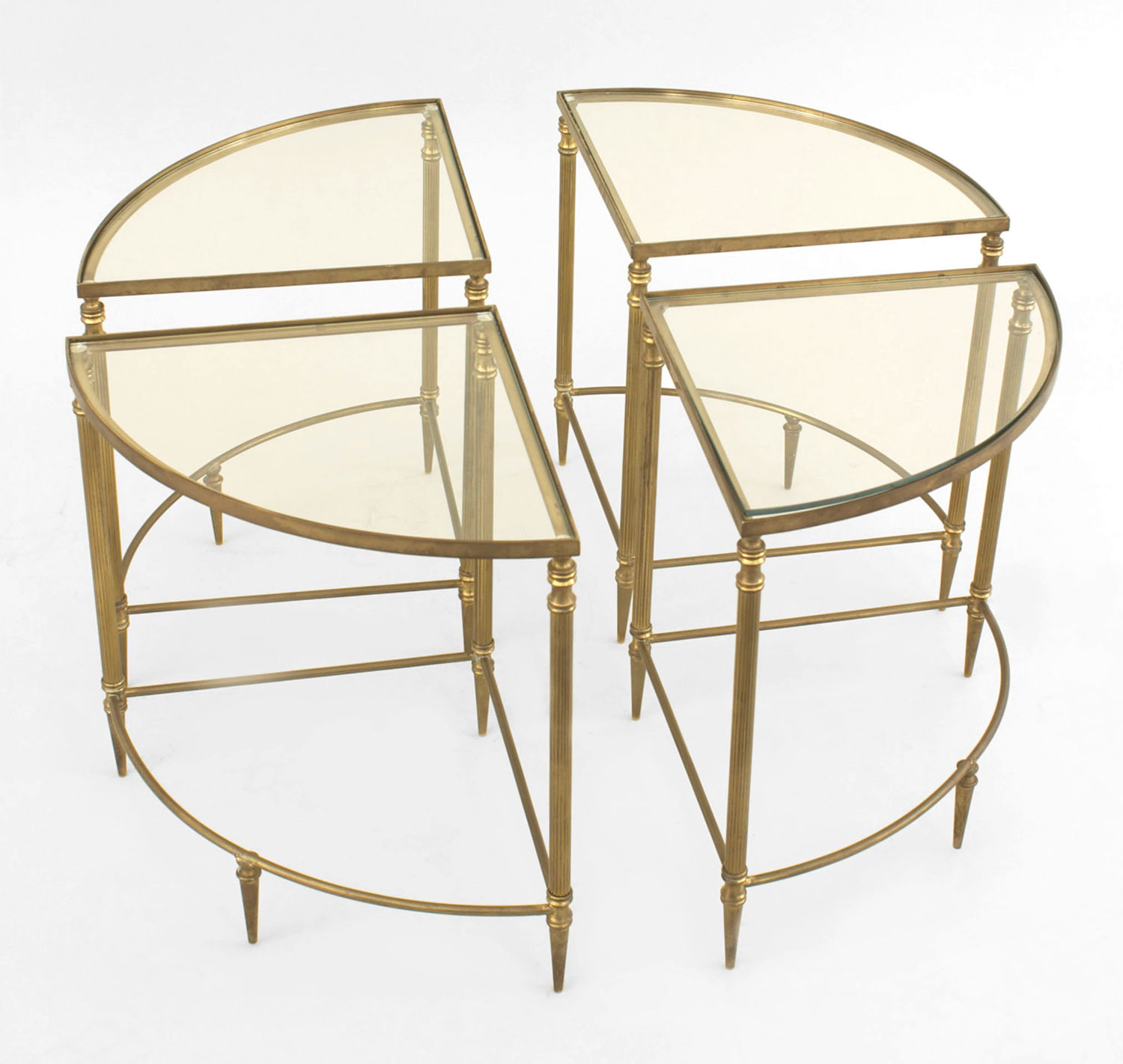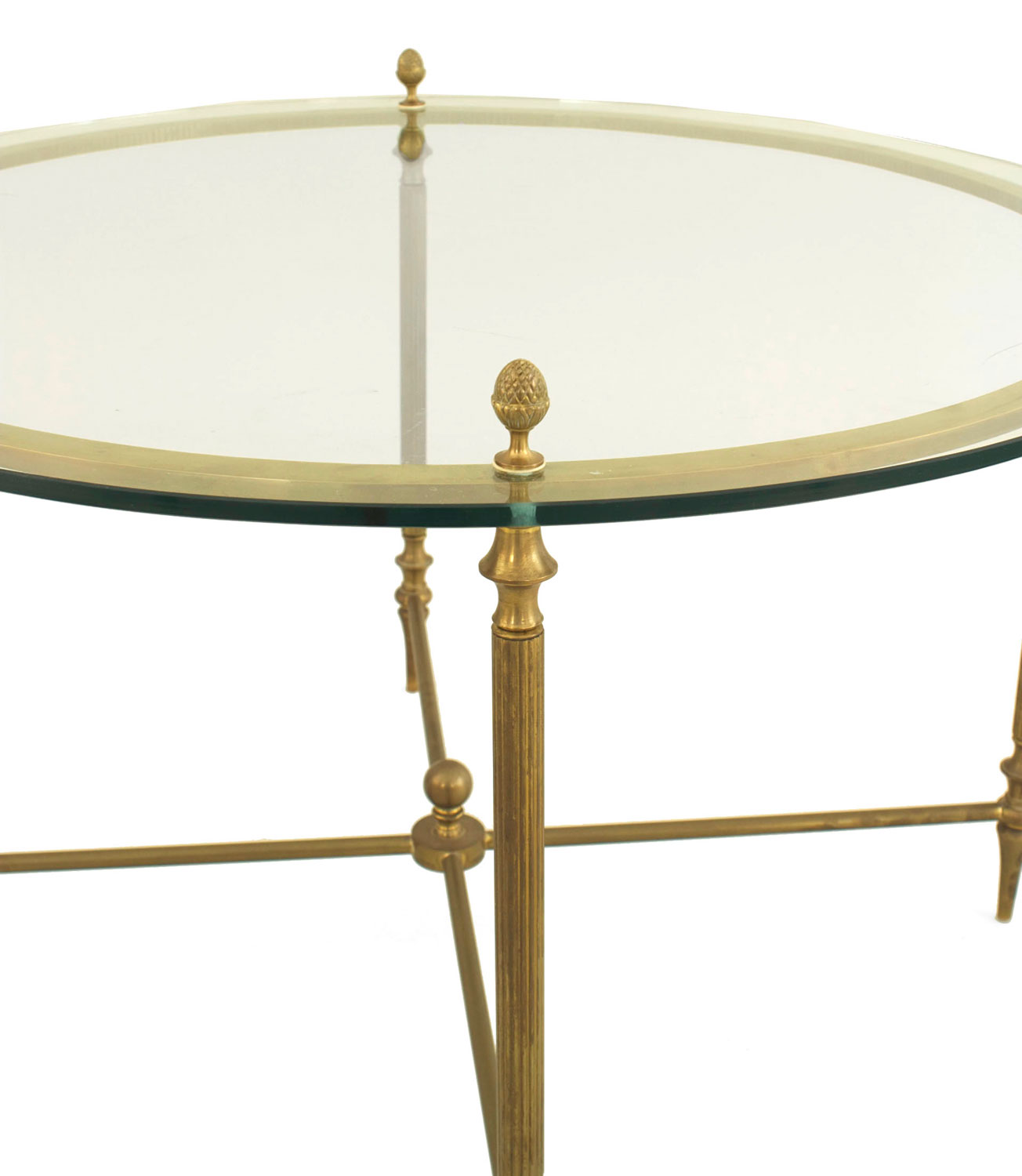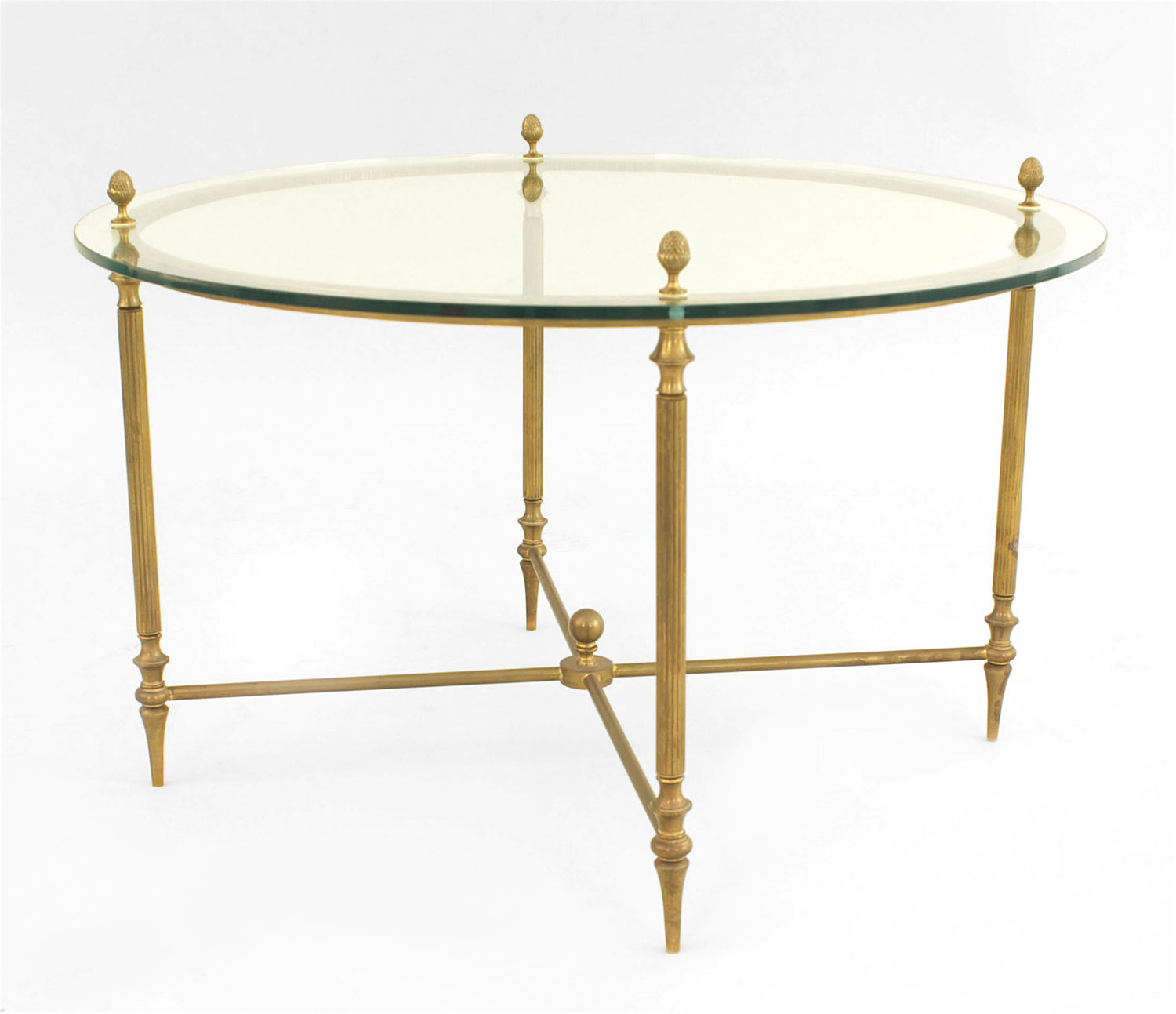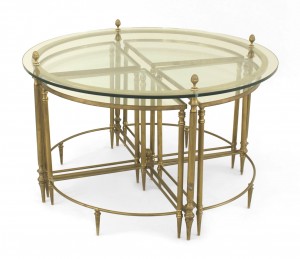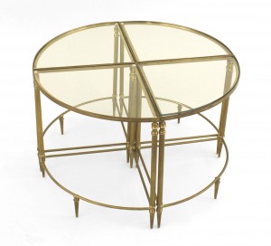 American Mid-Century brass round coffee table with a glass top with acorn finials and a lower stretcher which fits four small wedge-shaped glass top tables..