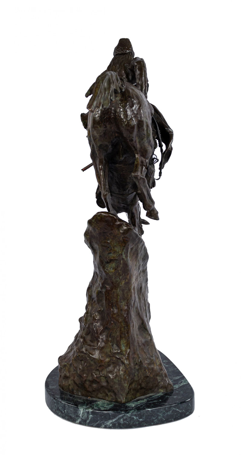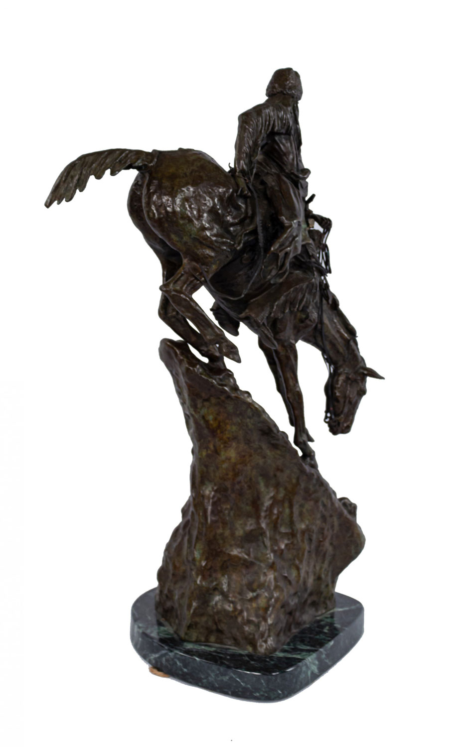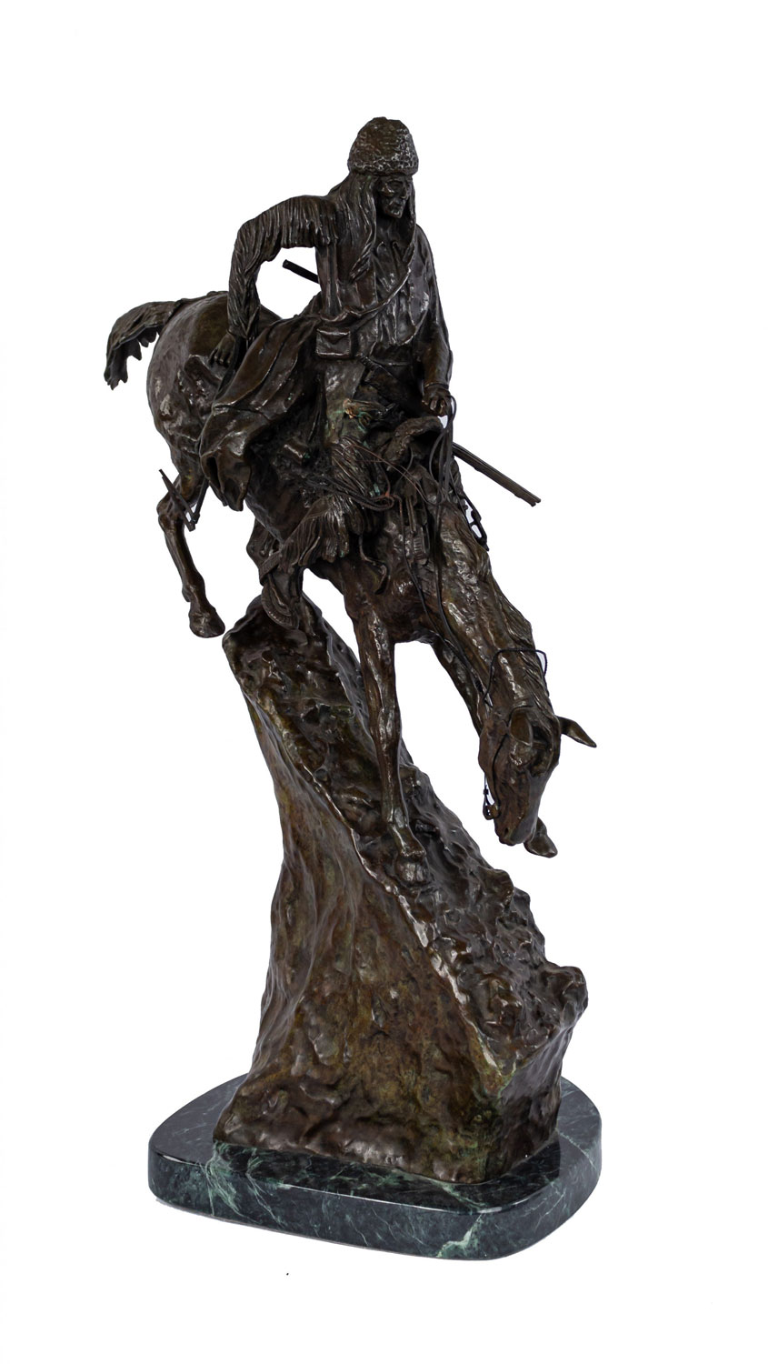 American bronze figure on horse going down a steep incline on a green oval-shaped marble base (later 20th Cent.recast of "Mountain Man" by Remington)