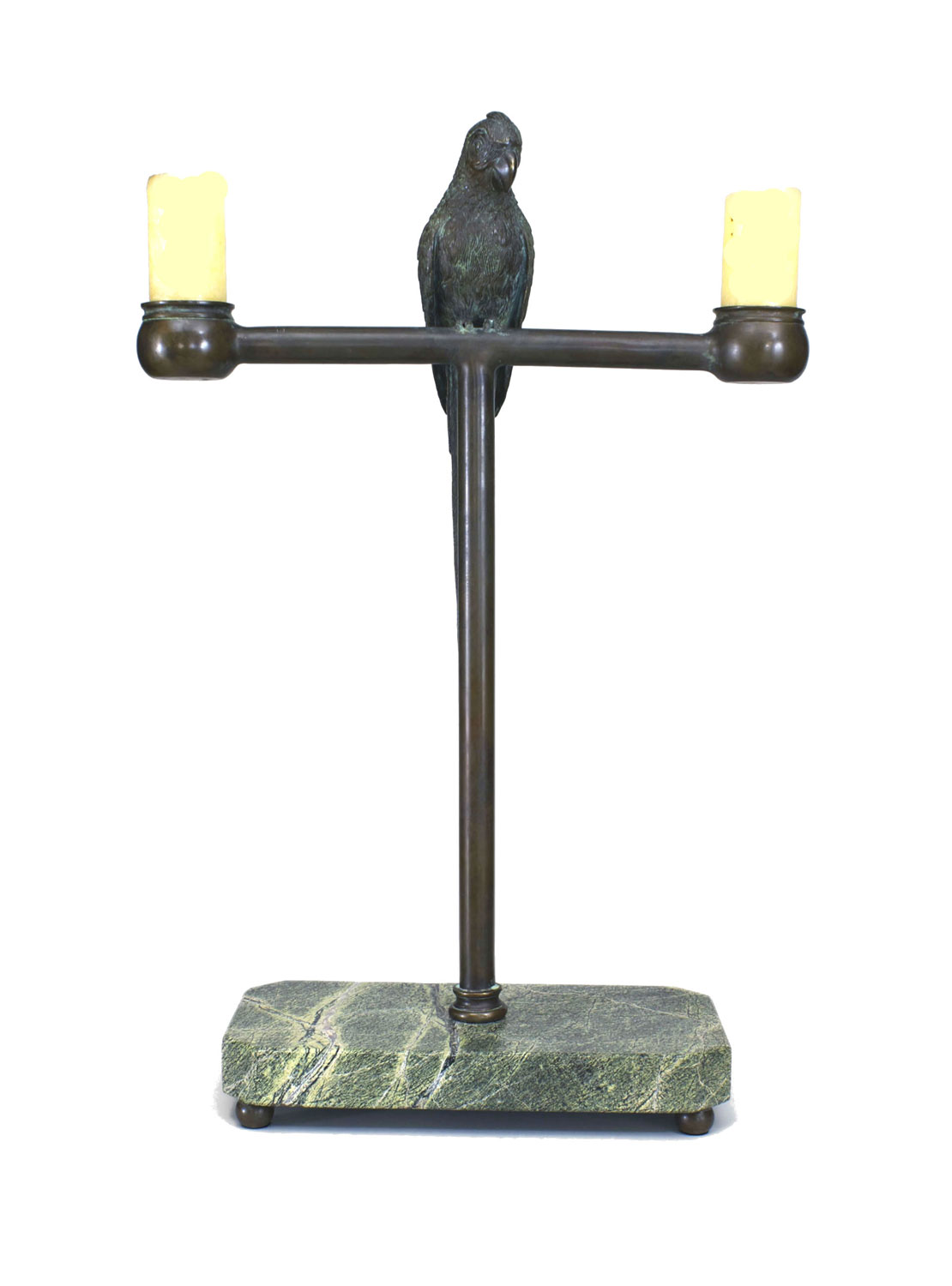 American Victorian (Late 19th Century) bronze life size parrot perched on a stand centering 2 candle holders and mounted on a rectangular green marble base..