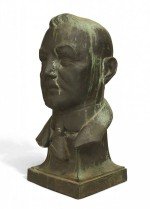 American 1940s bronze green patina bust of a gentleman wearing a jacket and tie raised on a square plinth.