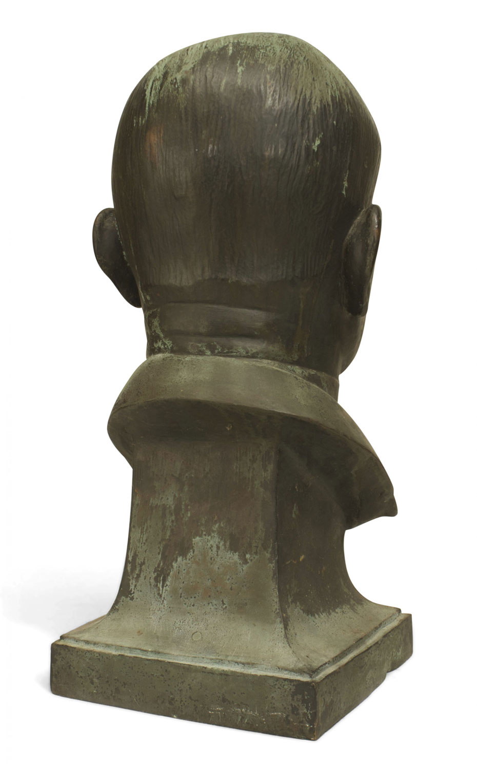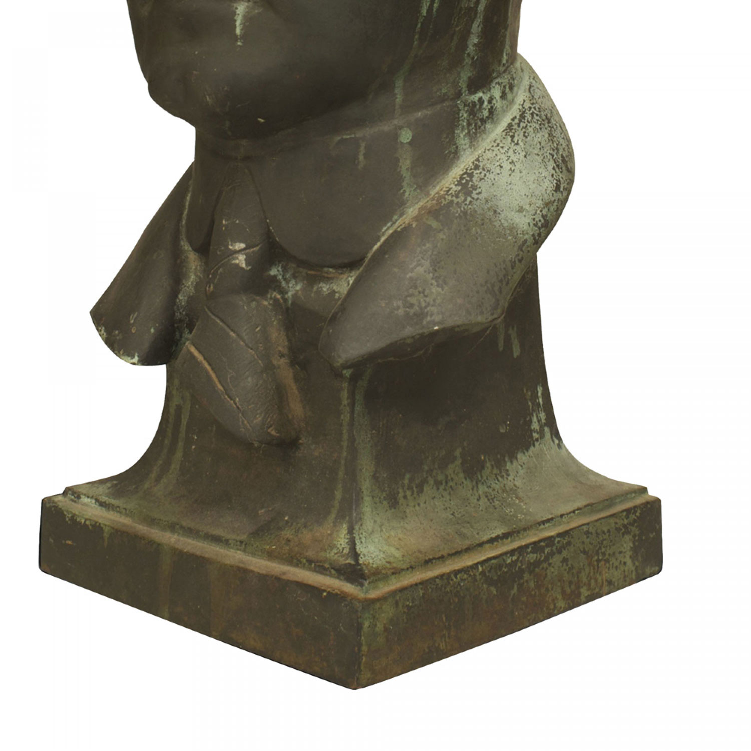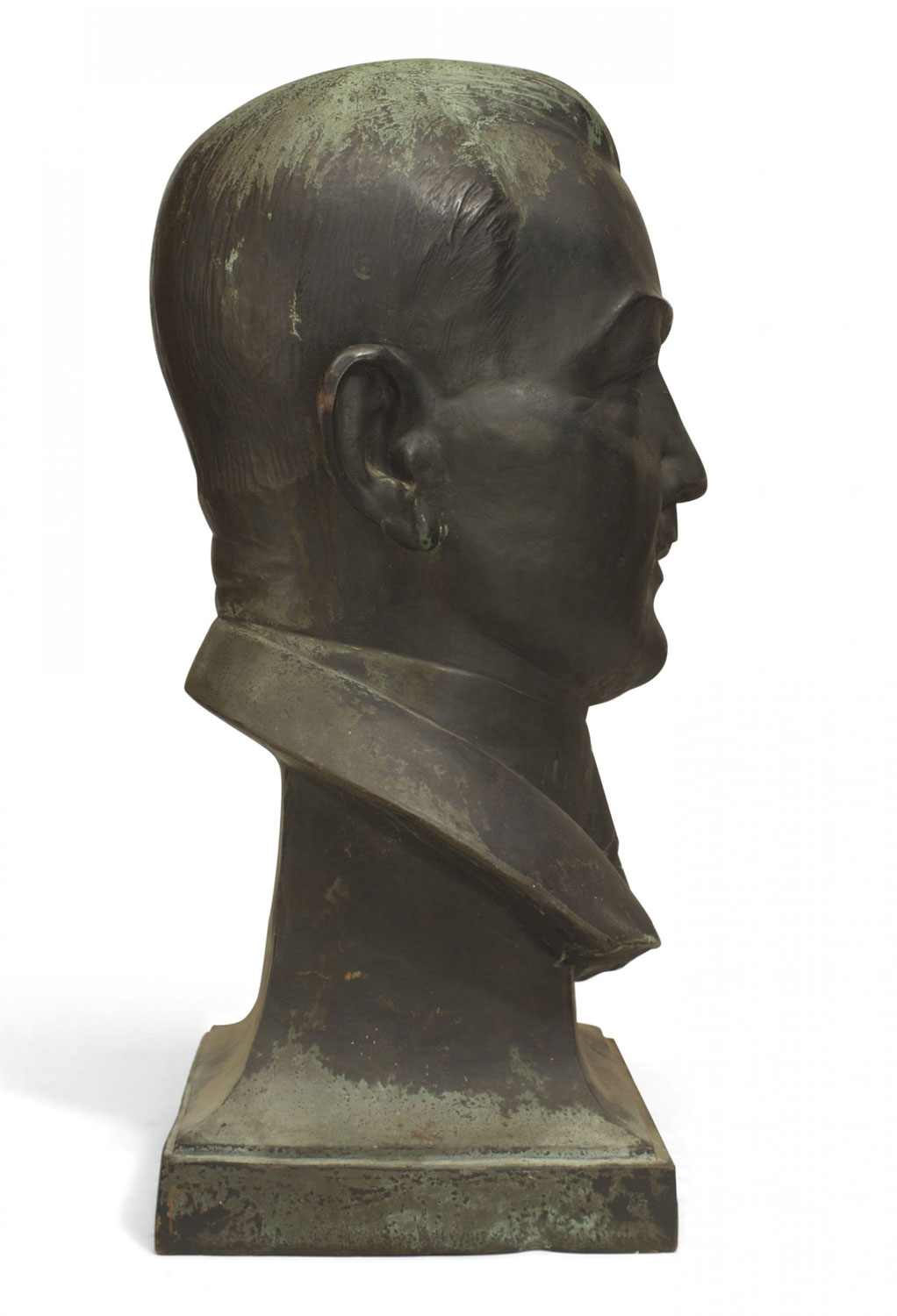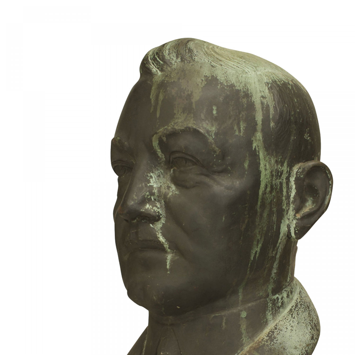 American 1940s bronze green patina bust of a gentleman wearing a jacket and tie raised on a square plinth