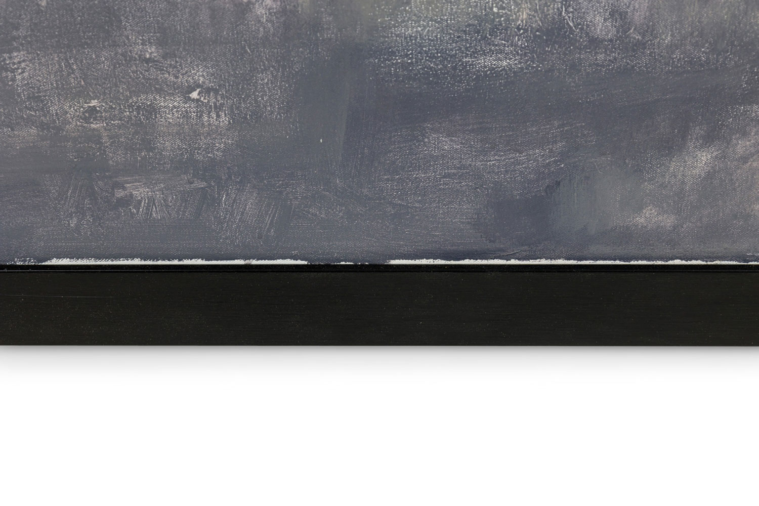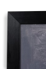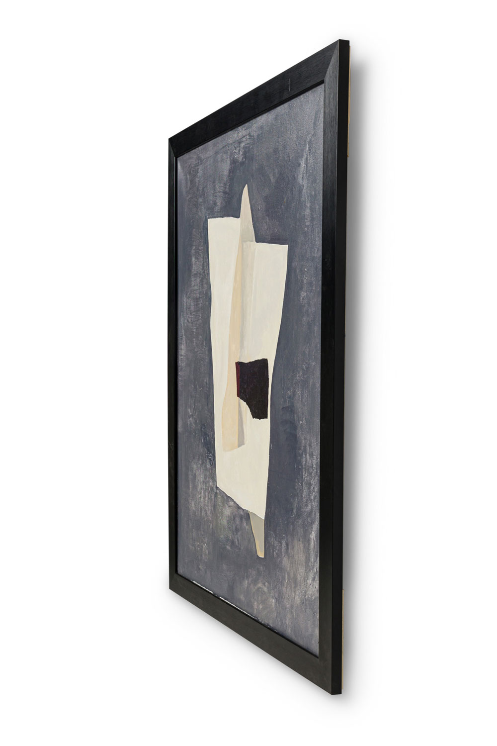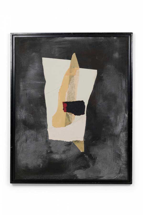 American contemporary abstract collage painting featuring a black background with yellow, grey, white and brown collage in a black painted wooden frame