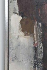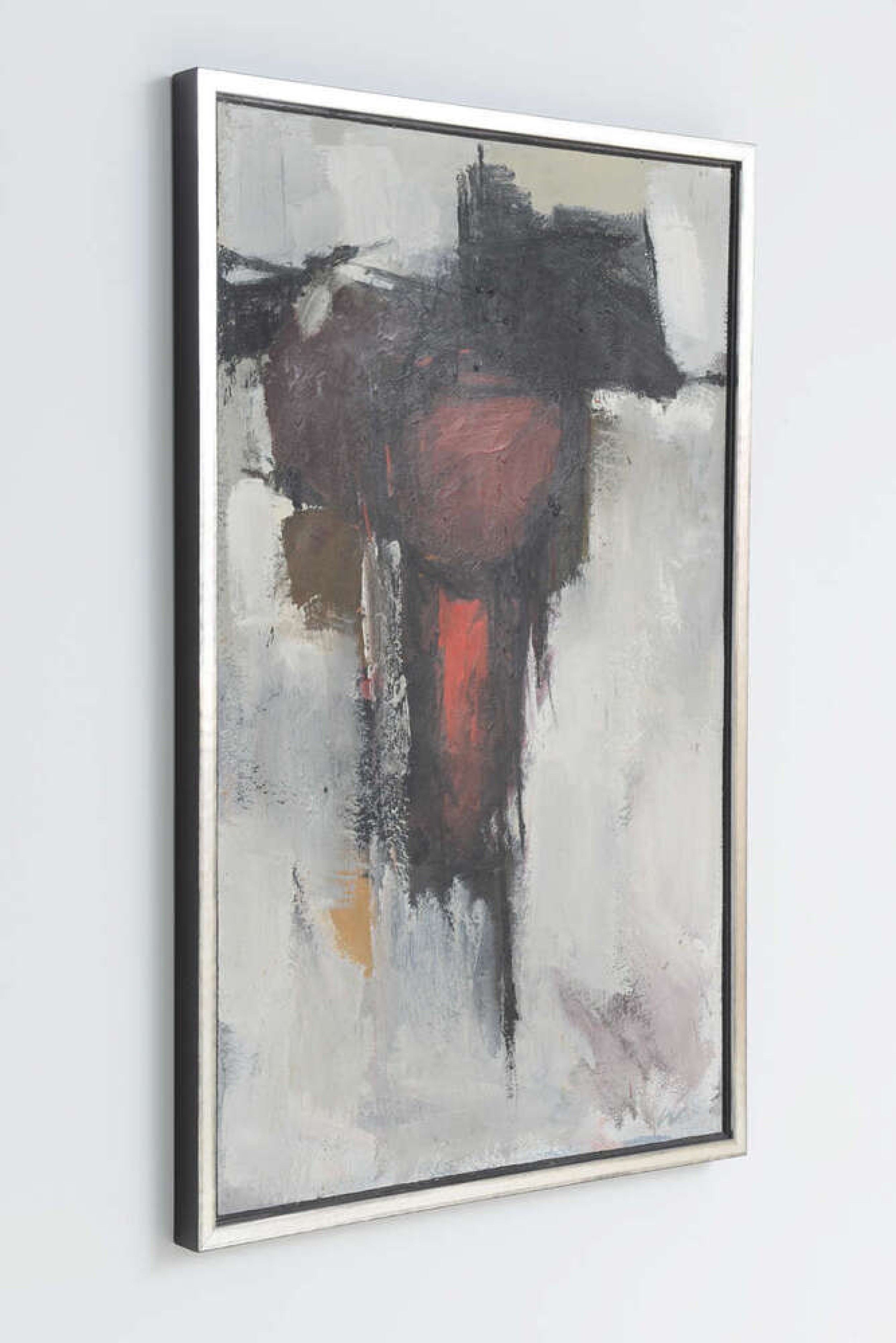 Contemporary abstract oil painting with black, red, and grey forms in a silver frame.