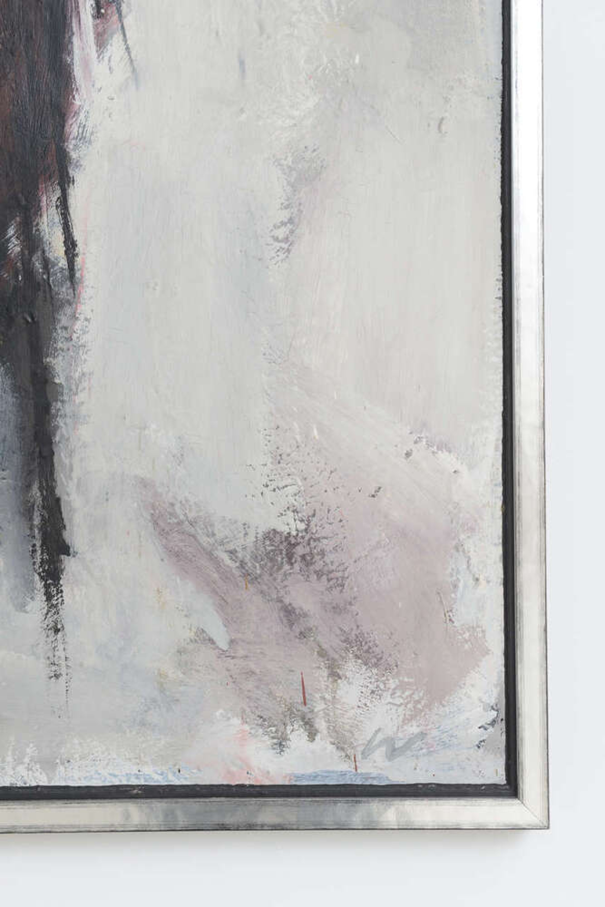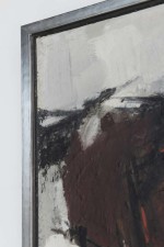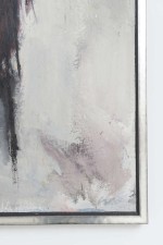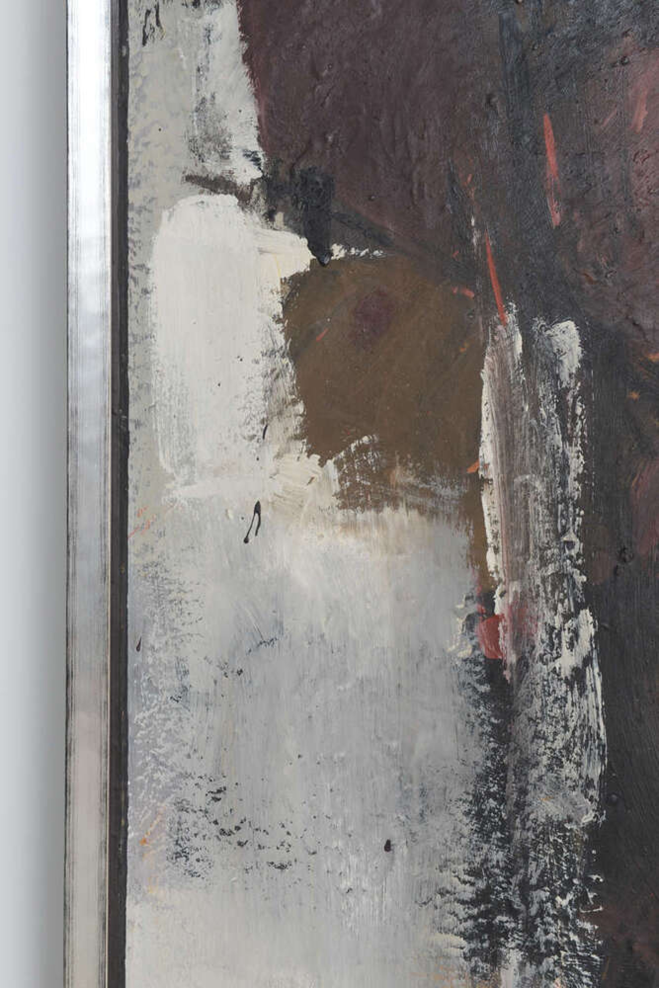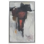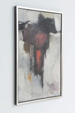 Contemporary abstract oil painting with black, red, and grey forms in a silver frame