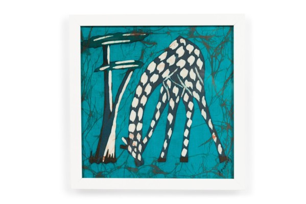 American Contemporary white framed abstract painting of a giraffe eating grass next to a tree, having a blue and black background (Similar to NWL7298B)