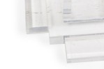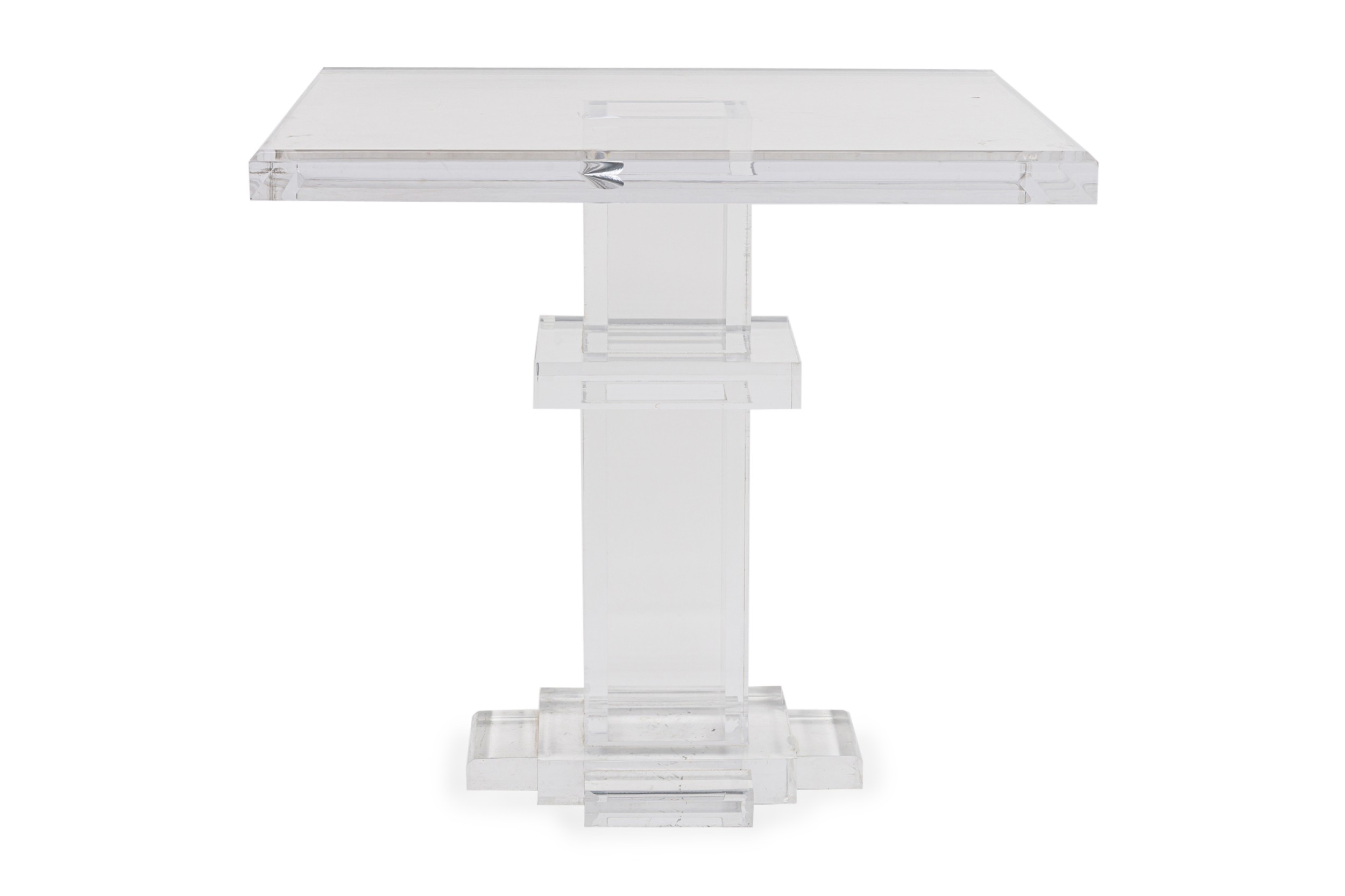 American Contemporary Lucite acrylic center / game table with square top over a pedestal resting on a tiered base (GEOFFREY BRADFIELD).