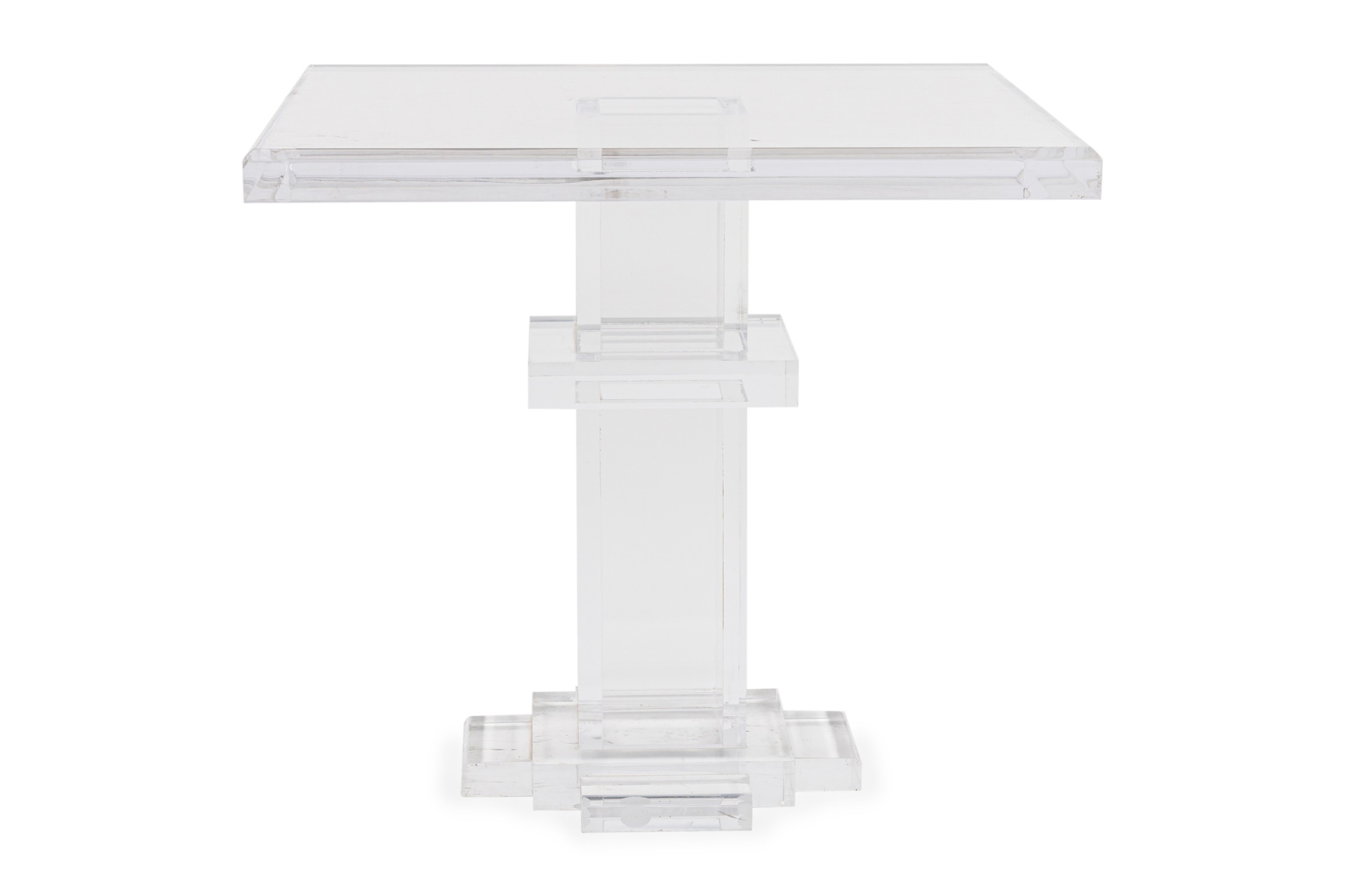 American Contemporary Lucite acrylic center / game table with square top over a pedestal resting on a tiered base (GEOFFREY BRADFIELD)