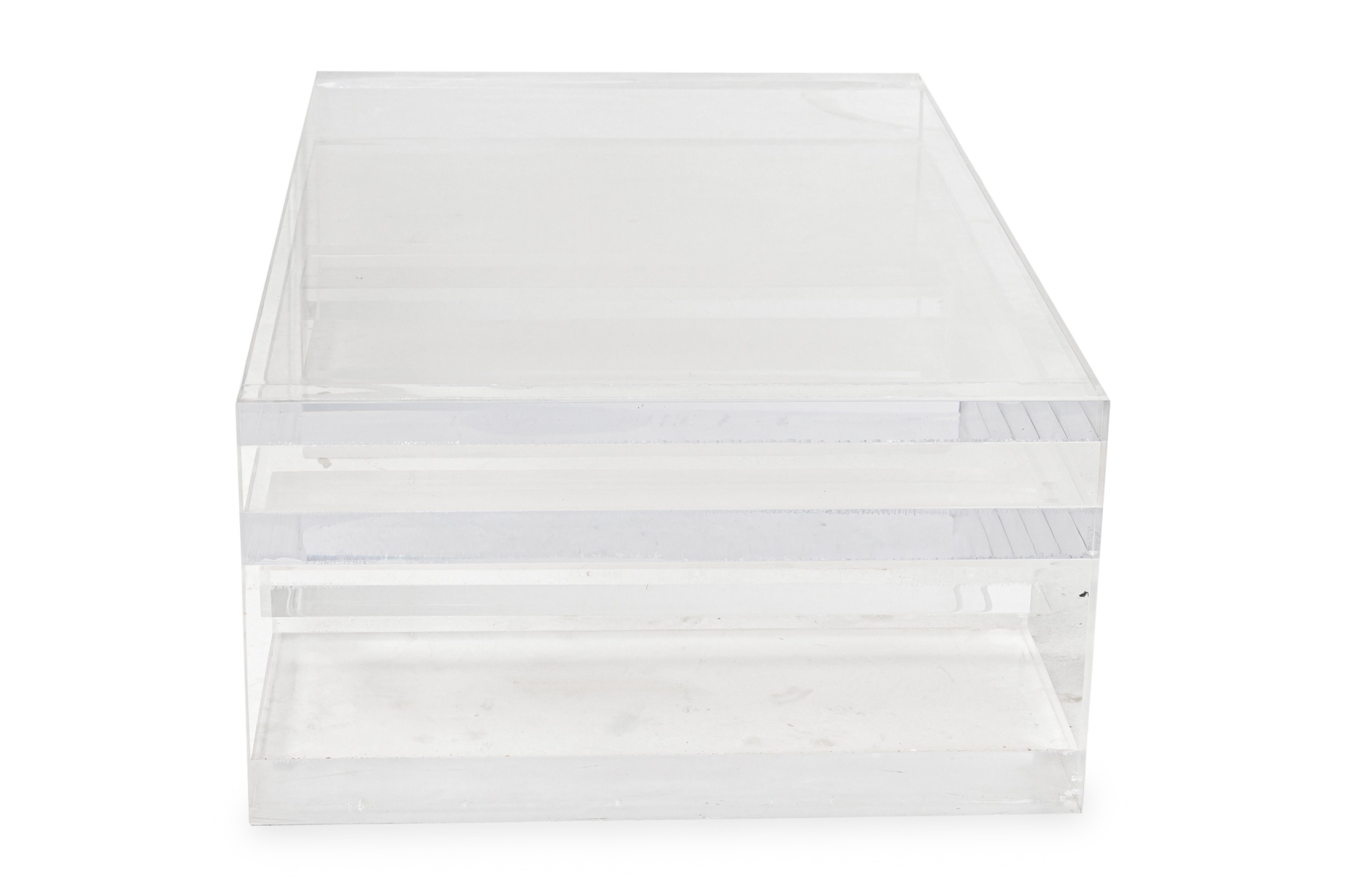 American Contemporary Lucite acrylic 2 tier coffee table in a Greek key style deisgn (designed by GEOFFREY BRADFIELD)