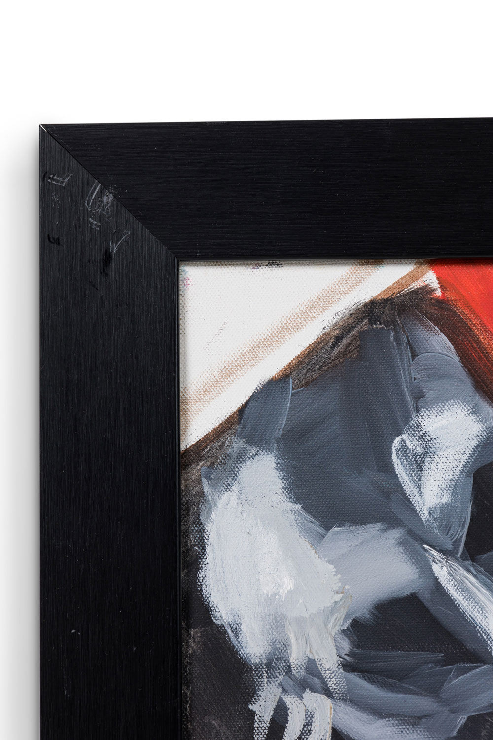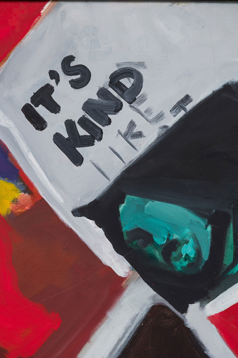 American contemporary acrylic on canvas painting of a red background with hand painted and collaged close-up photographs of people