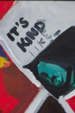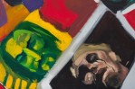 American contemporary acrylic on canvas painting of a red background with hand painted and collaged close-up photographs of people.