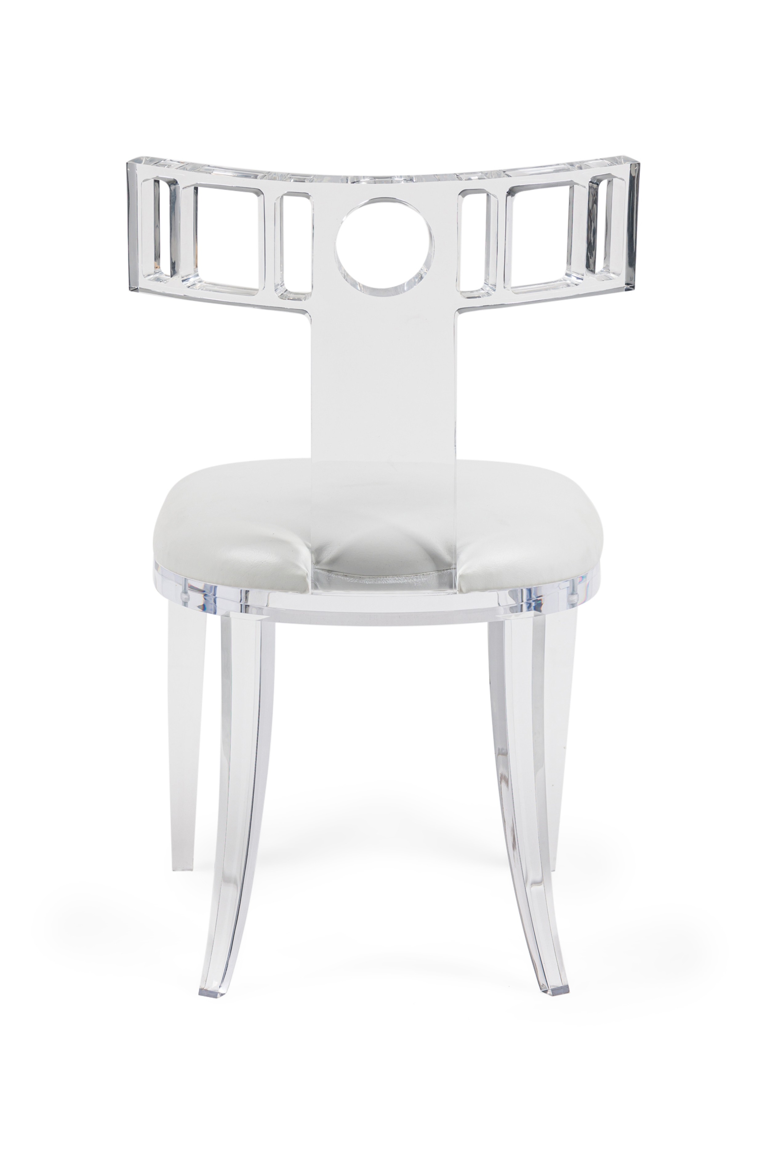 American Contemporary Lucite acrylic round "T" form back side chair with a white upholstered seat cushion (GEOFFREY BRADFIELD).