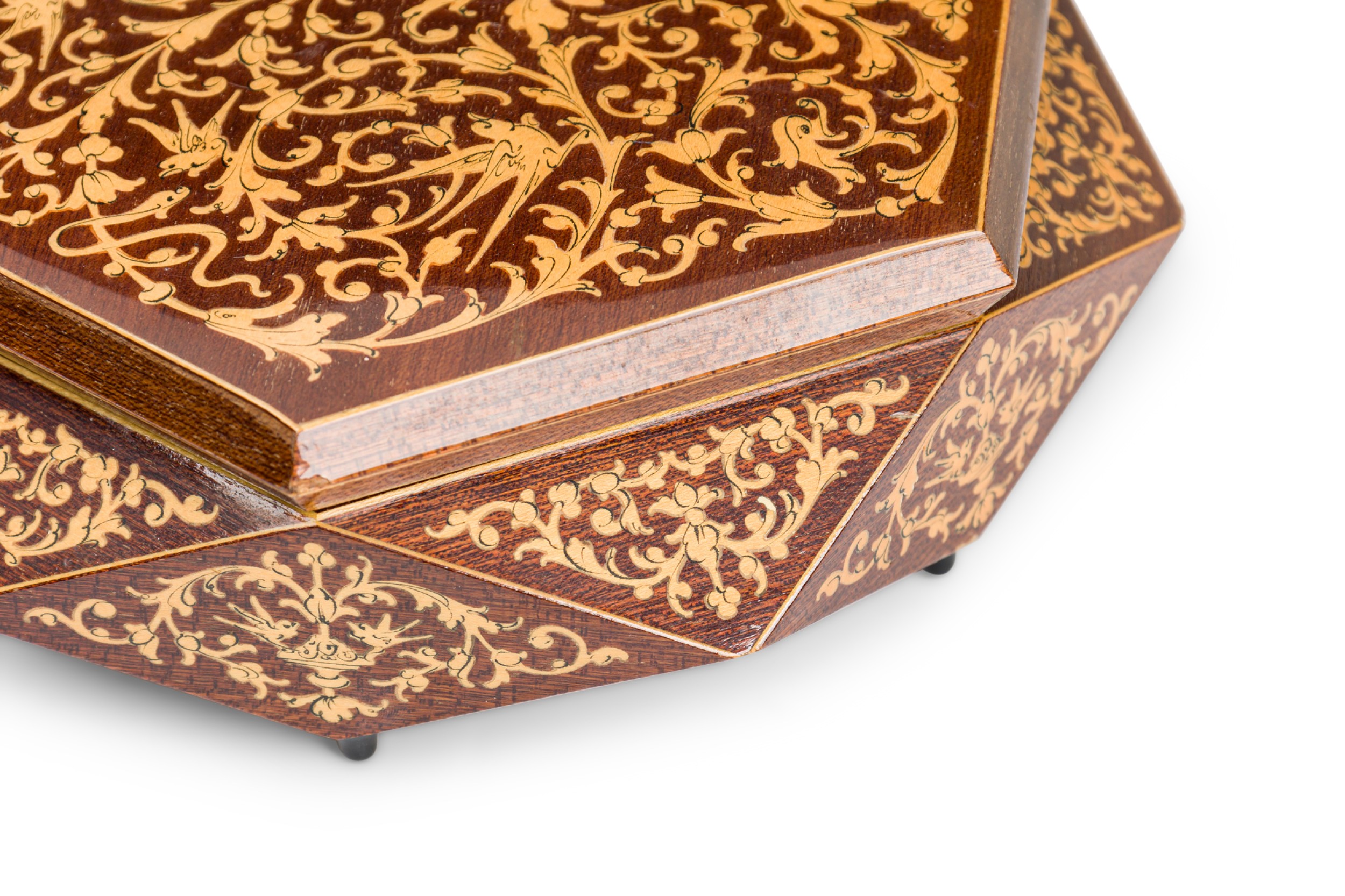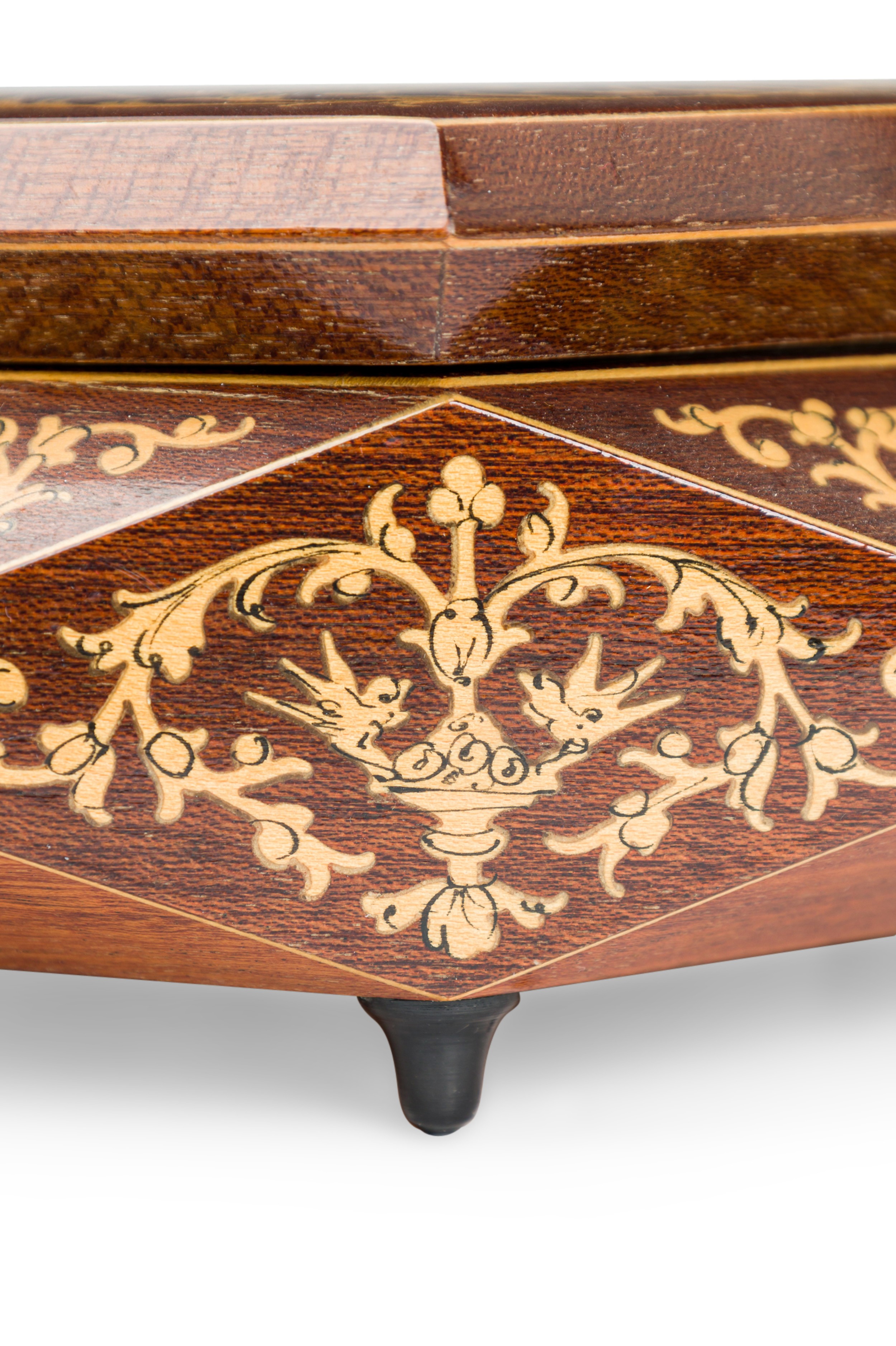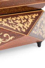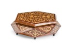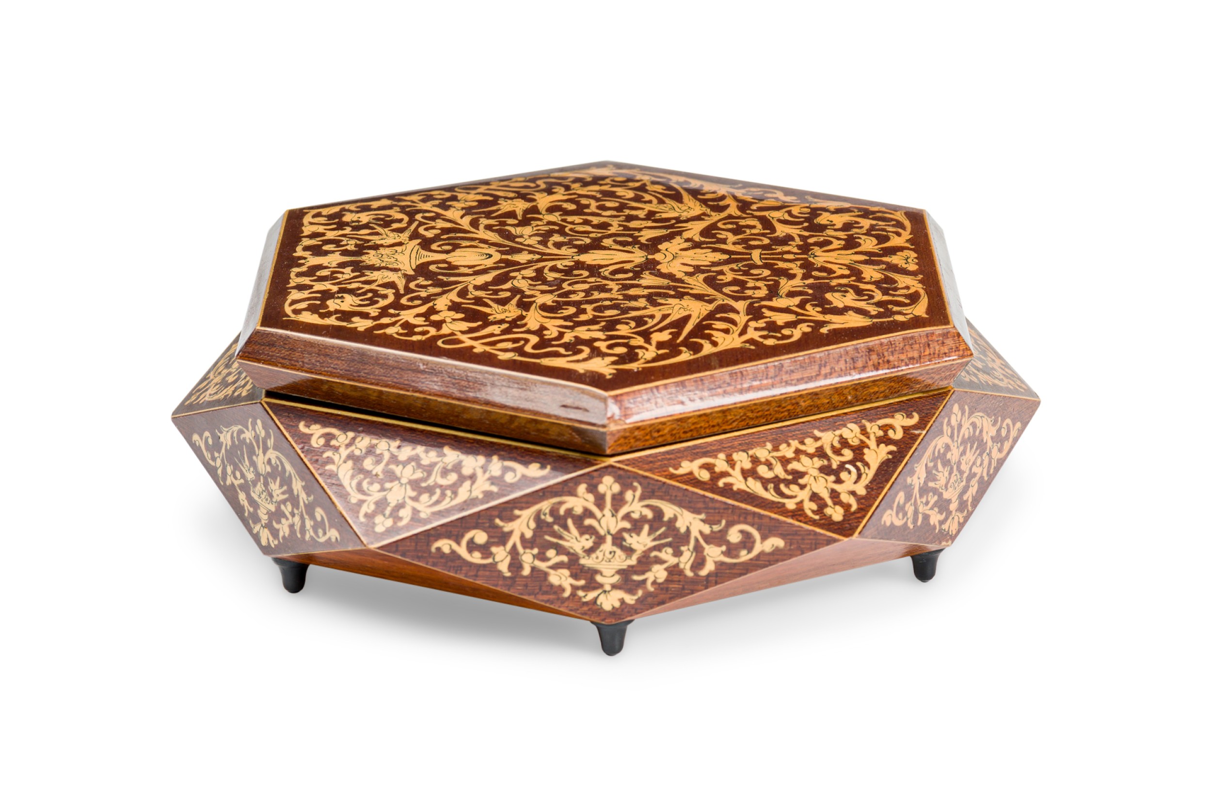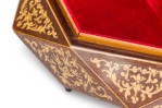 American Contemporary beige and brown inlaid wood hexagonal geometric jewelry box