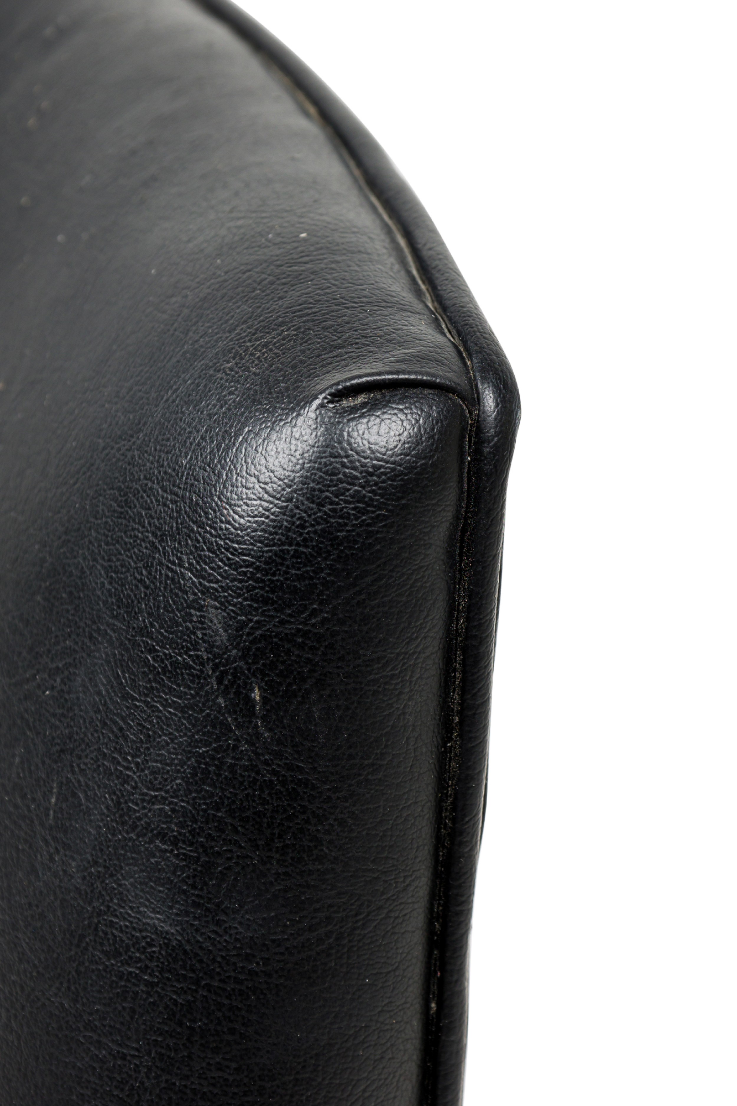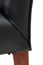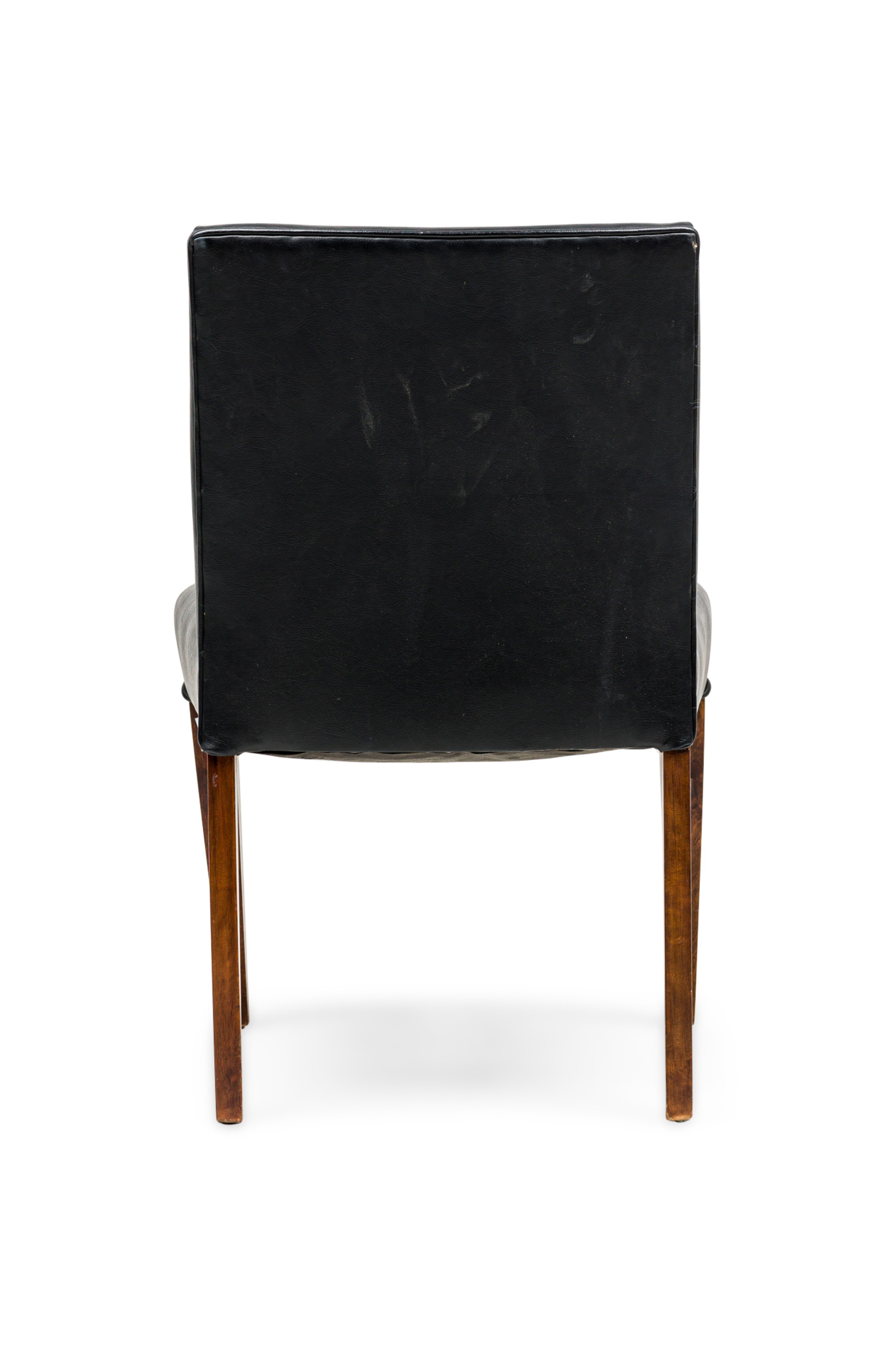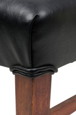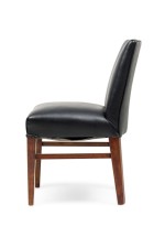 American contemporary black leather side chair with a stretcher on both sides connecting the legs