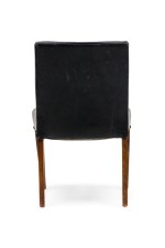 American contemporary black leather side chair with a stretcher on both sides connecting the legs.