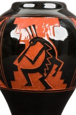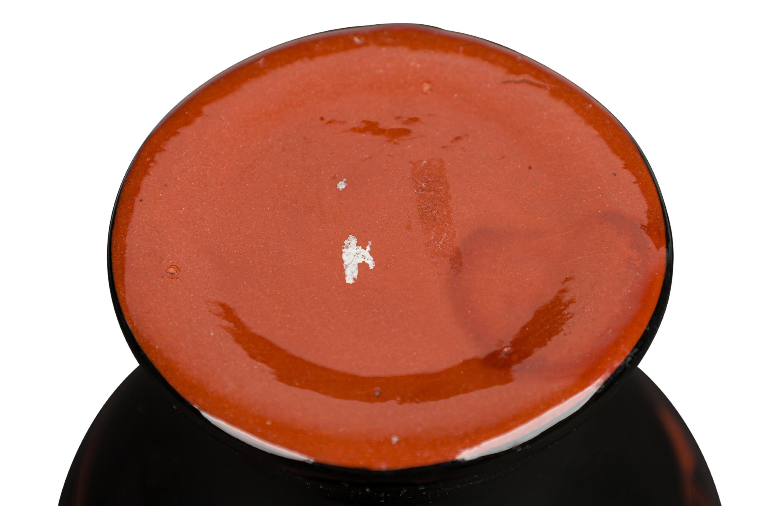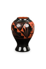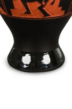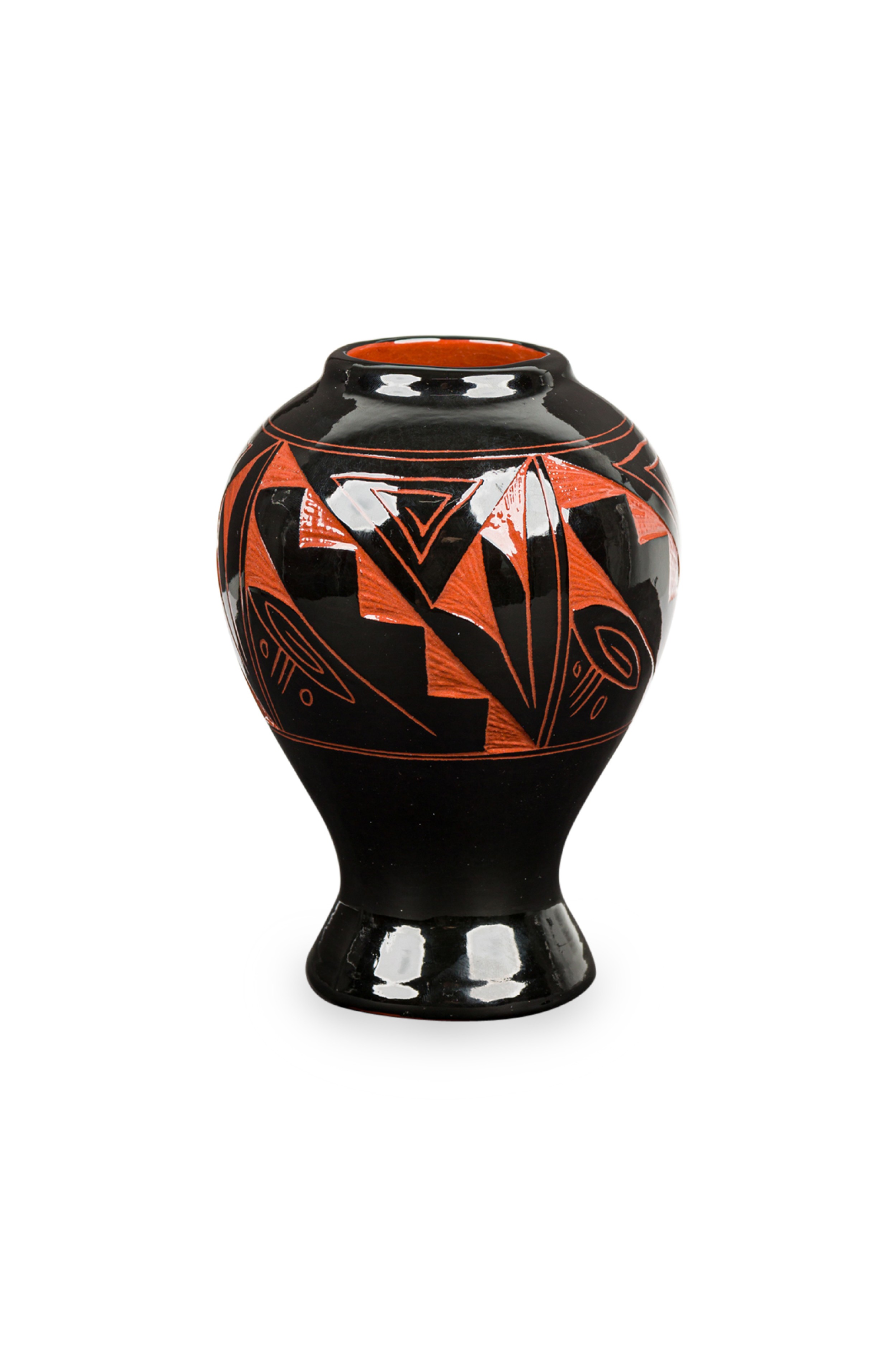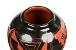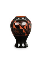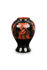 American Contemporary Art Deco style black and orange small urn featuring geometric patterns and figures.