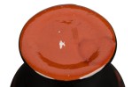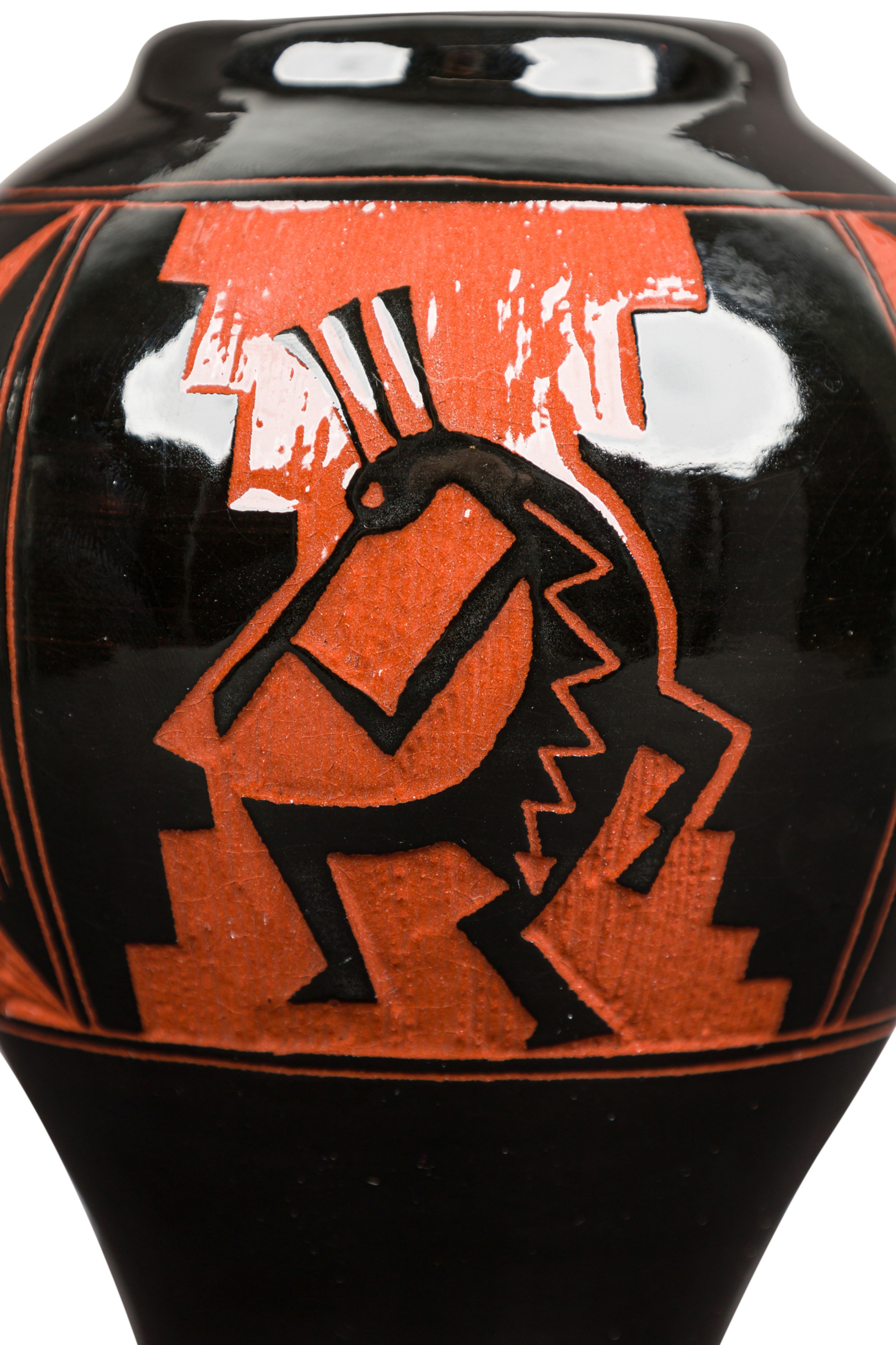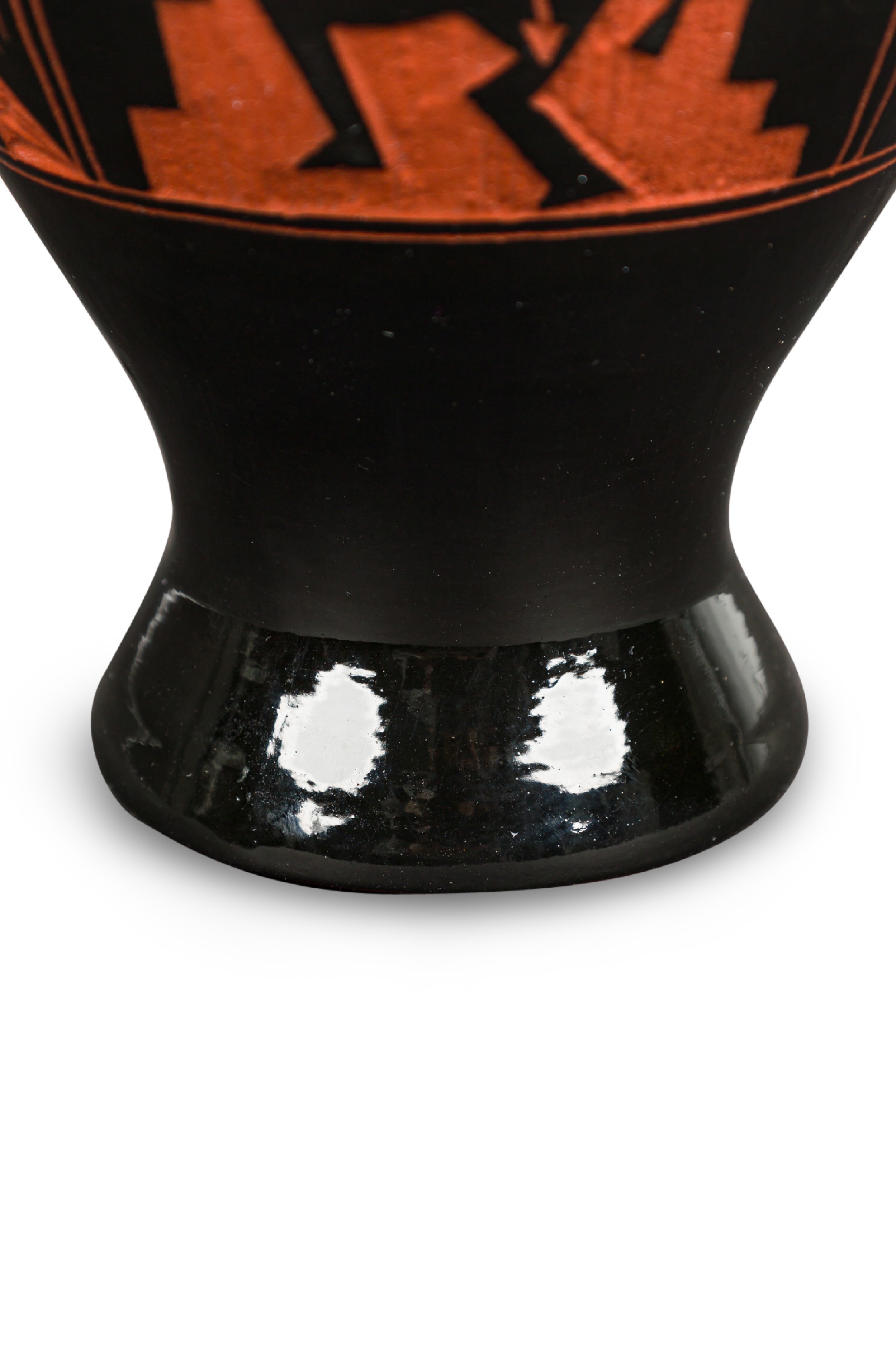 American Contemporary Art Deco style black and orange small urn featuring geometric patterns and figures
