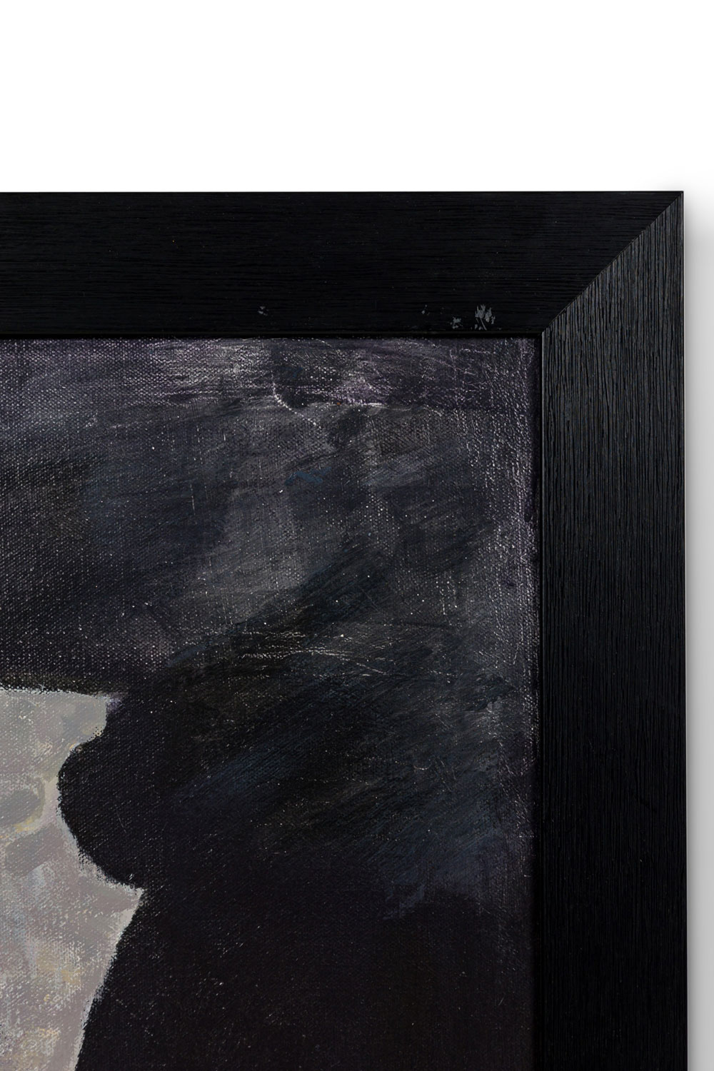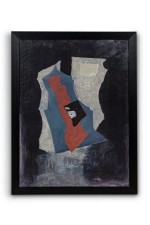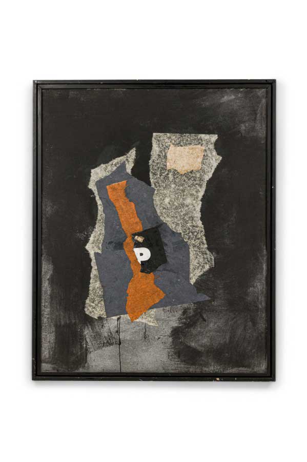 American contemporary abstract expressionism painting with a black background with collage in grey, yellow, umber and black