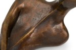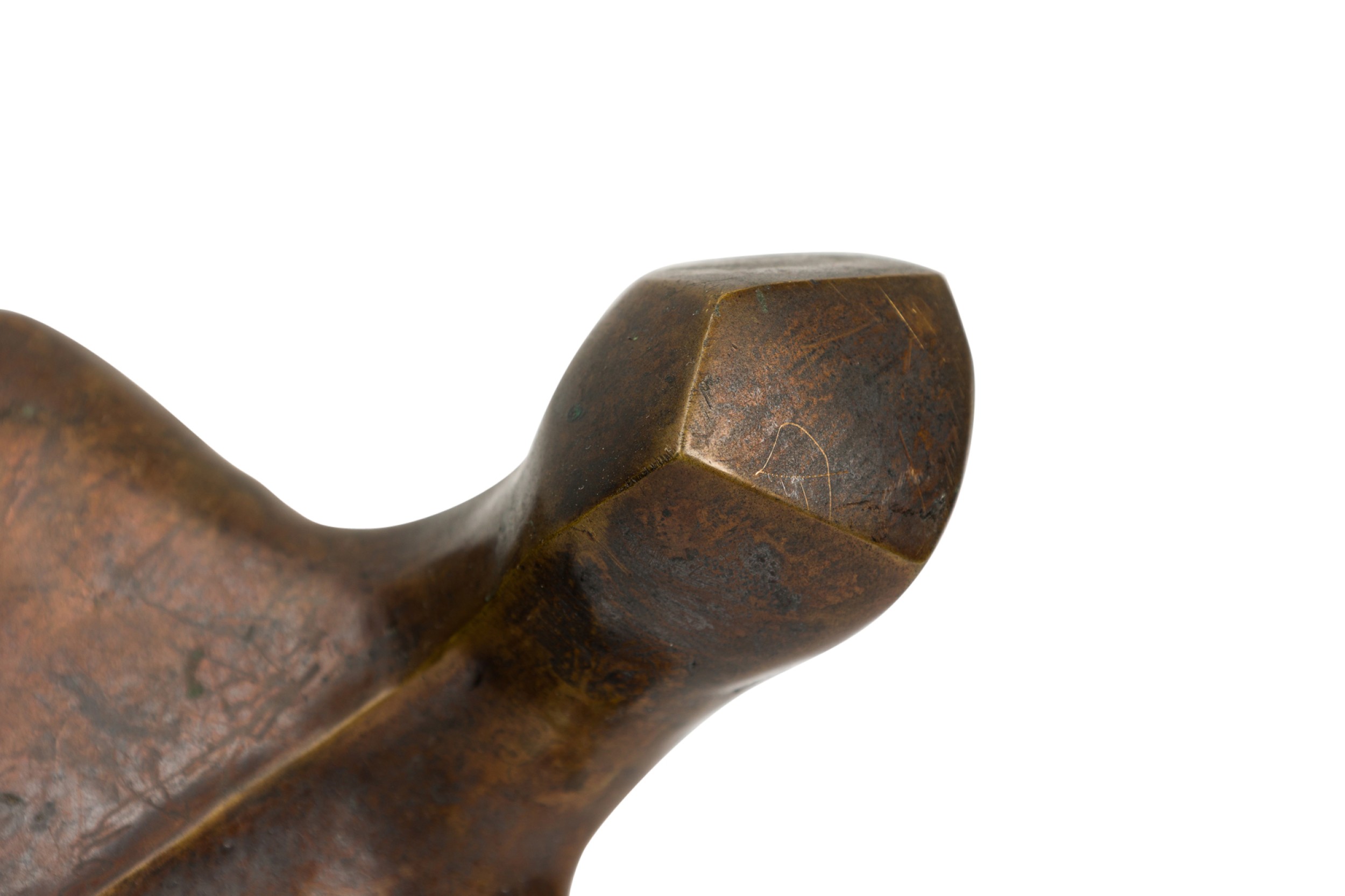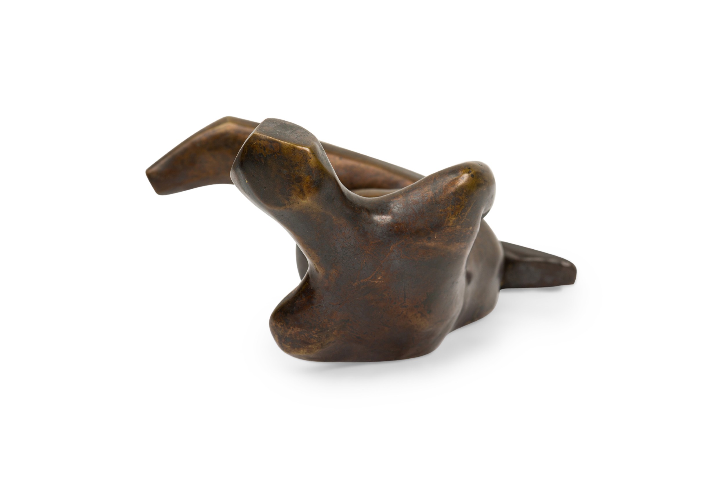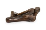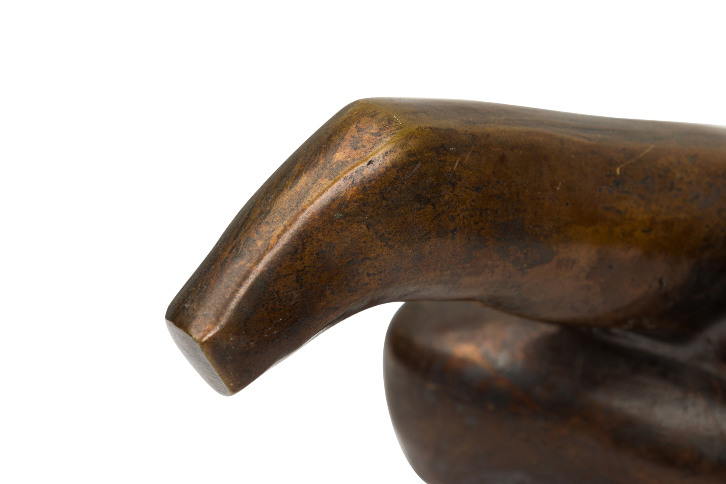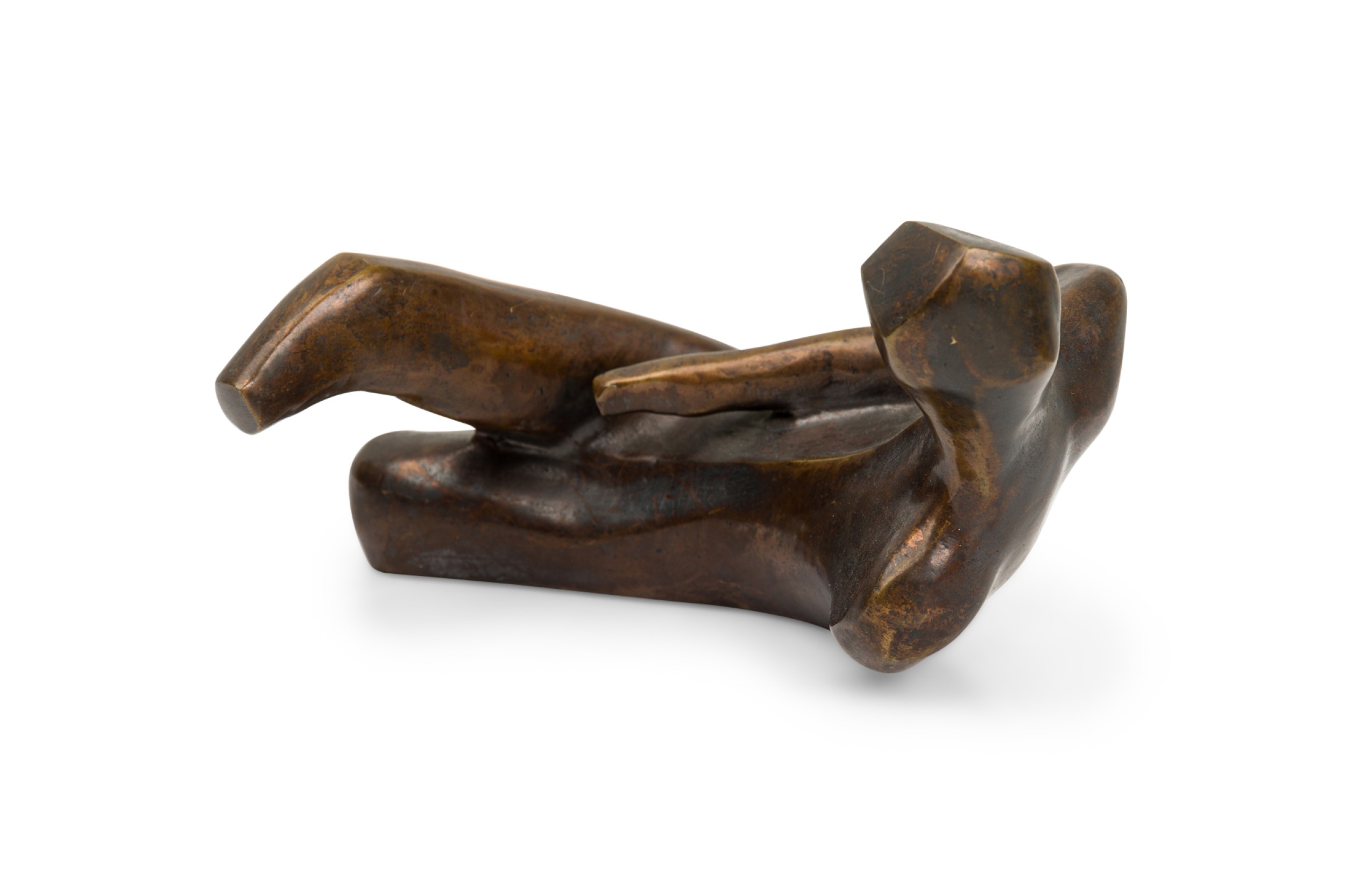American Contemporary Modernist bronze sculpture with a brown patina of a male laying down on his side having one leg forward and the other bent behind him (unsigned)