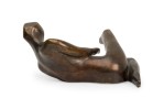 American Contemporary Modernist bronze sculpture with a brown patina of a male laying down on his side having one leg forward and the other bent behind him (unsigned).