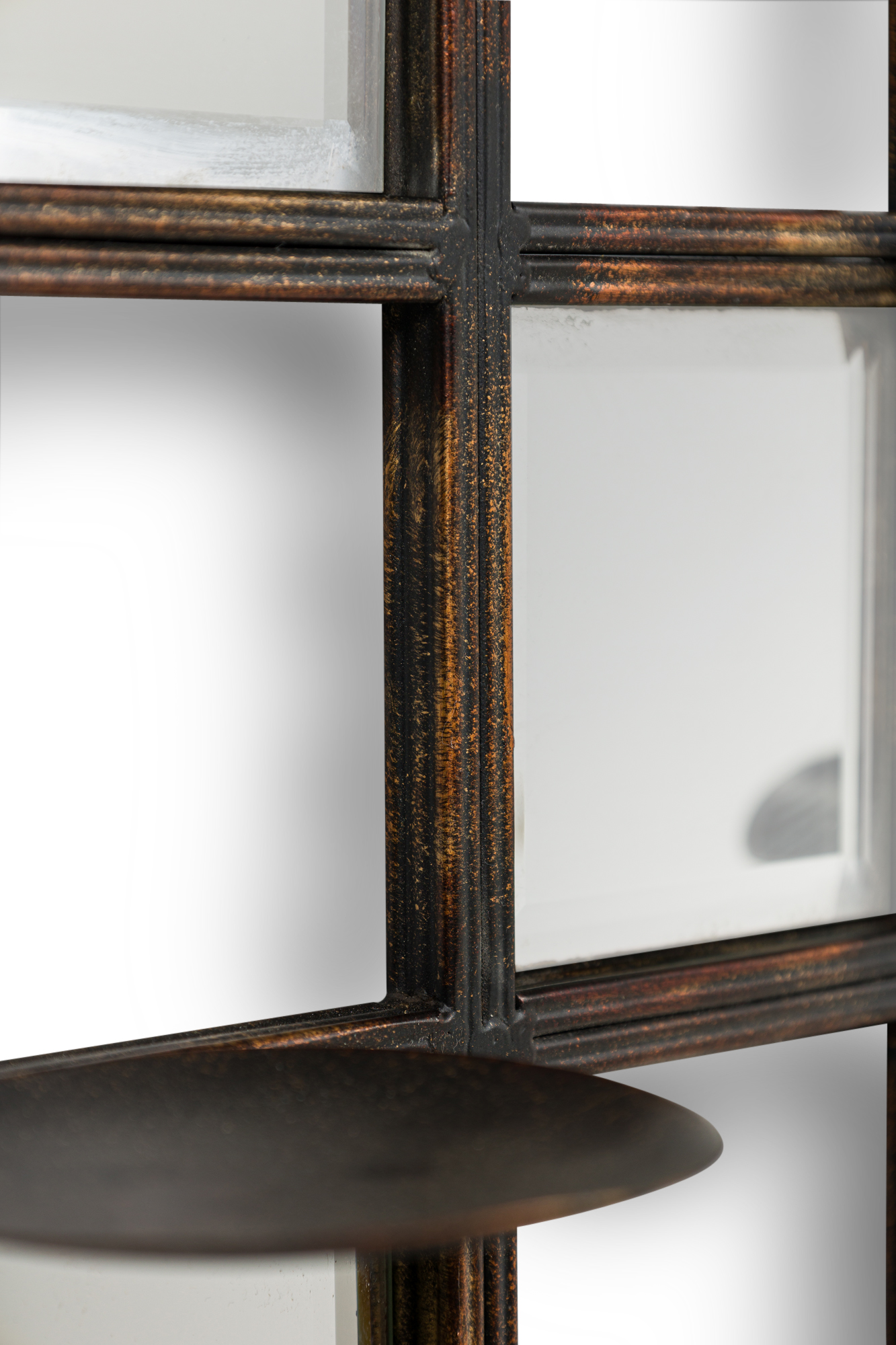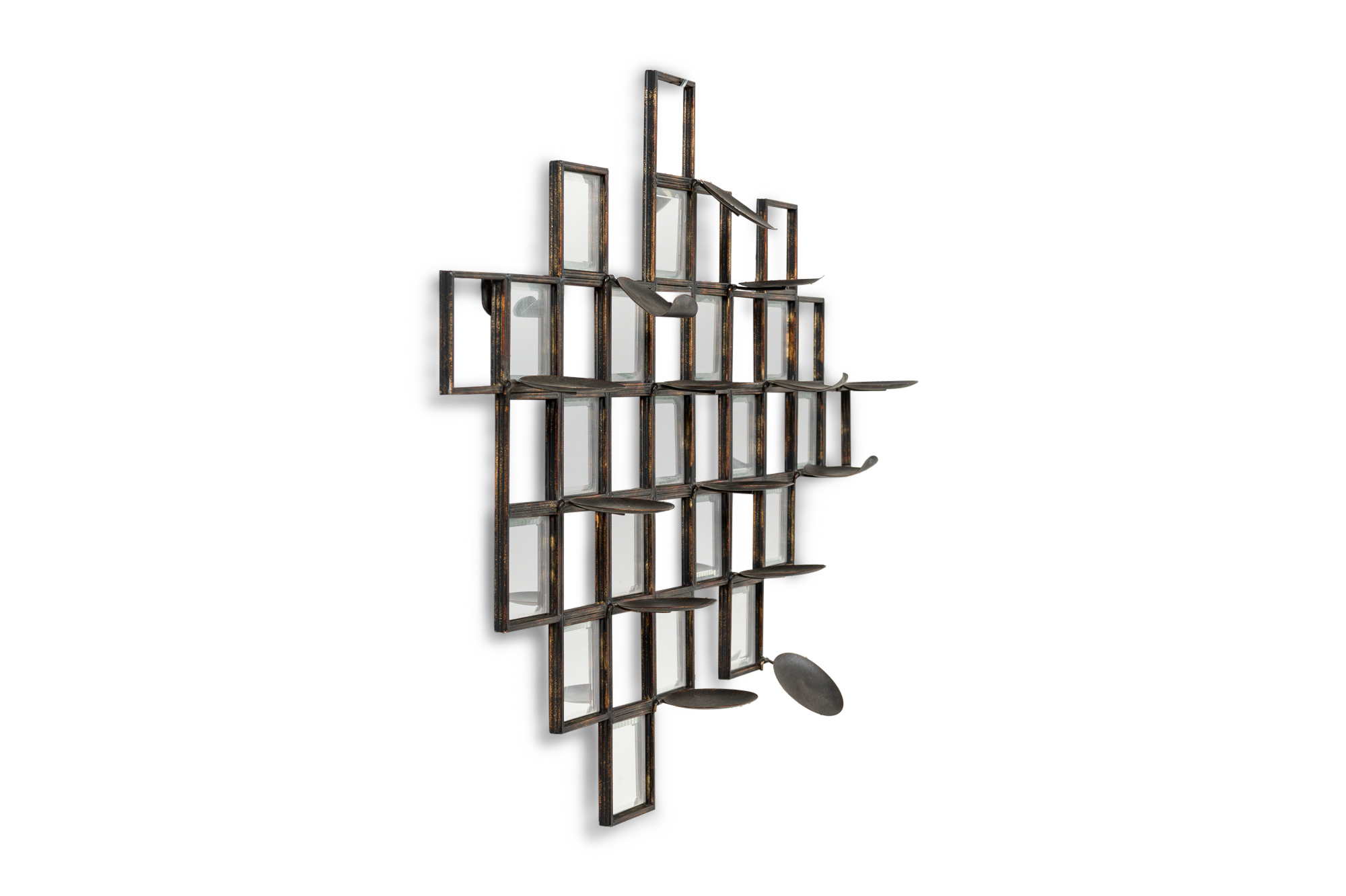 American Contemporary wall sculpture with a checker board pattern with some spaces have a mirror with extended circulars to hold candles.